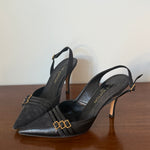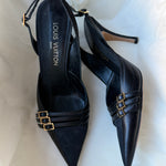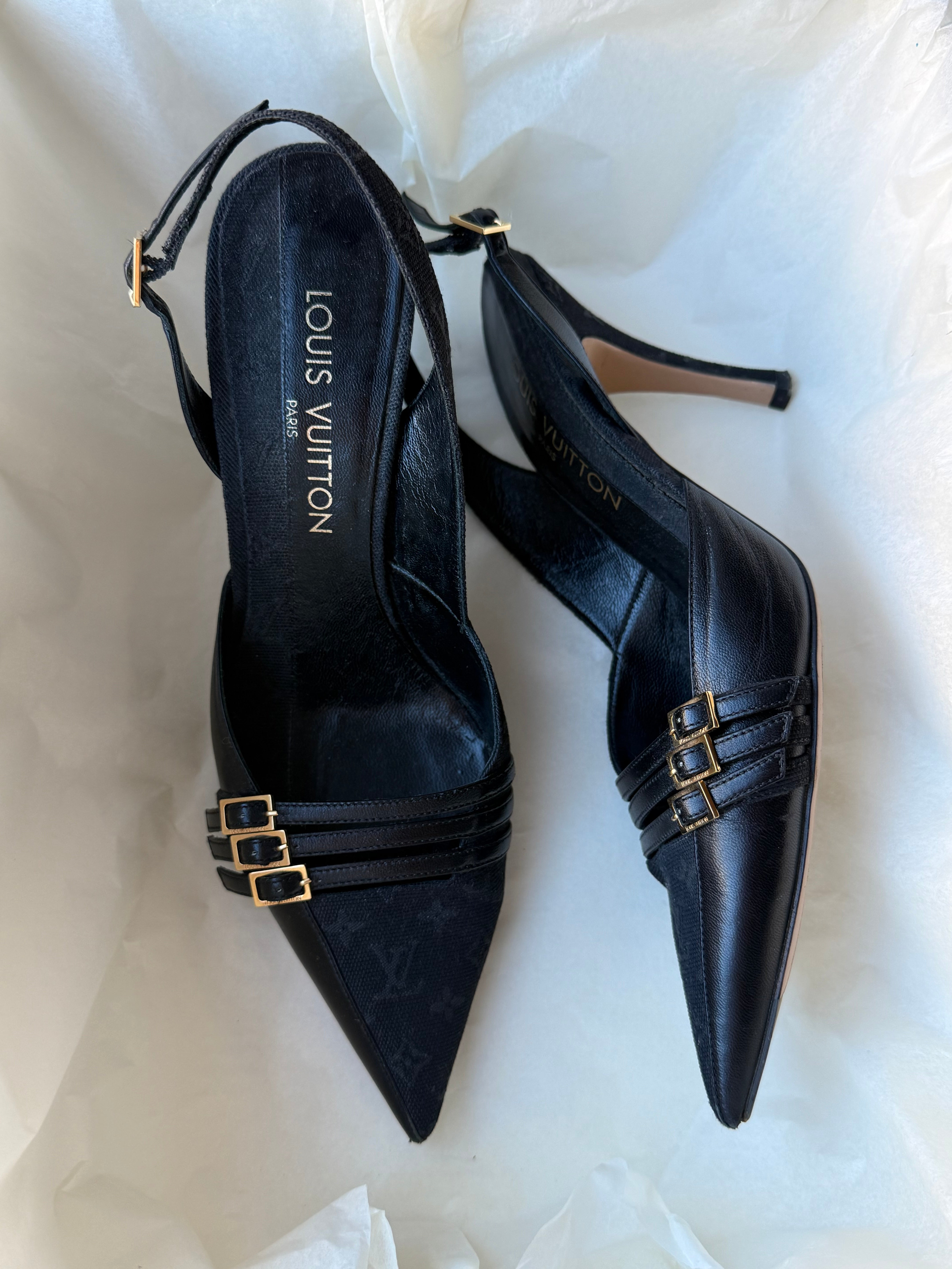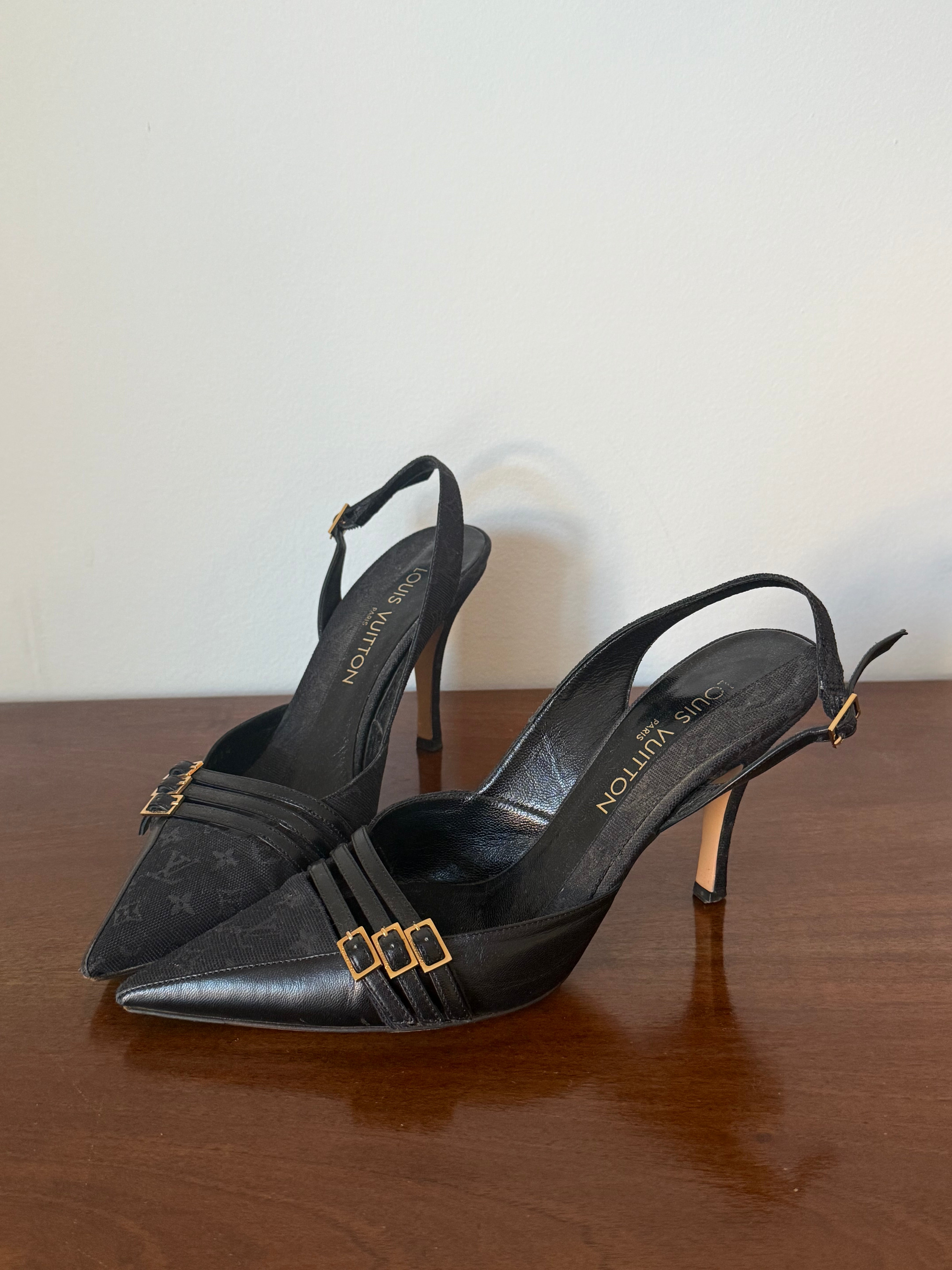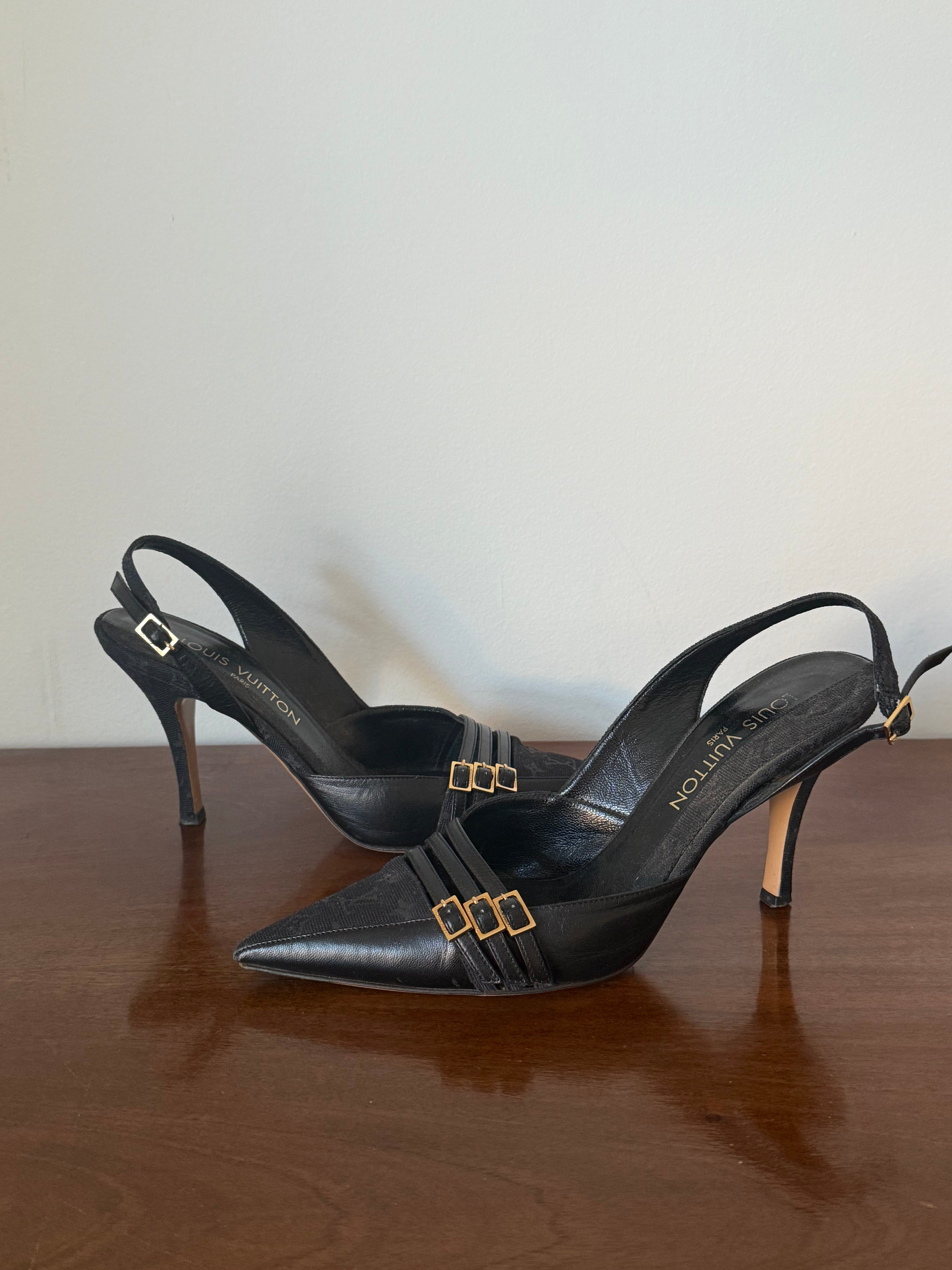 Early 2000s Louis Vuitton black monogram canvas slingback heels featuring pointed toes, leather accents, engraved buckle embellishments, and gold-tone hardware.