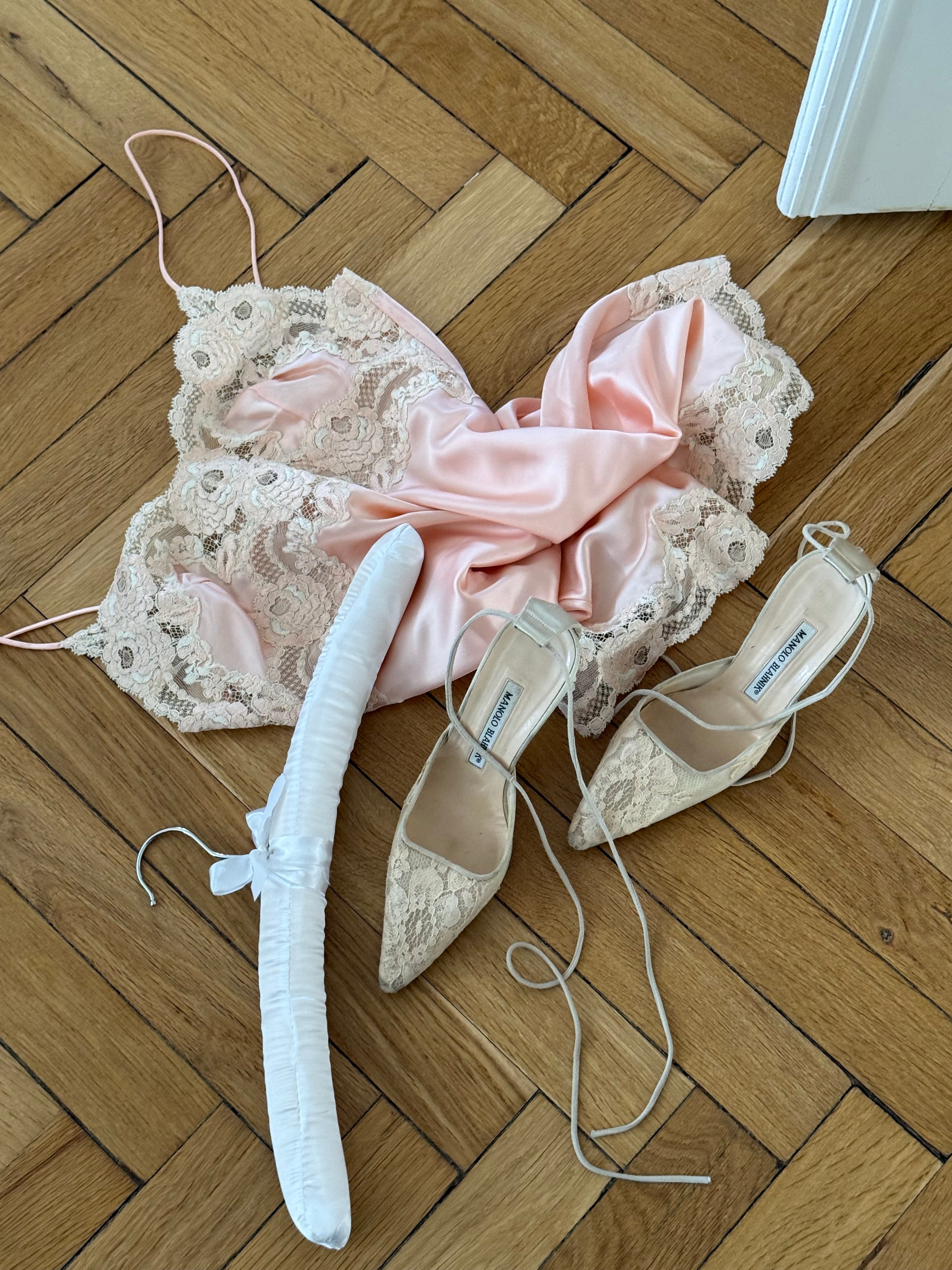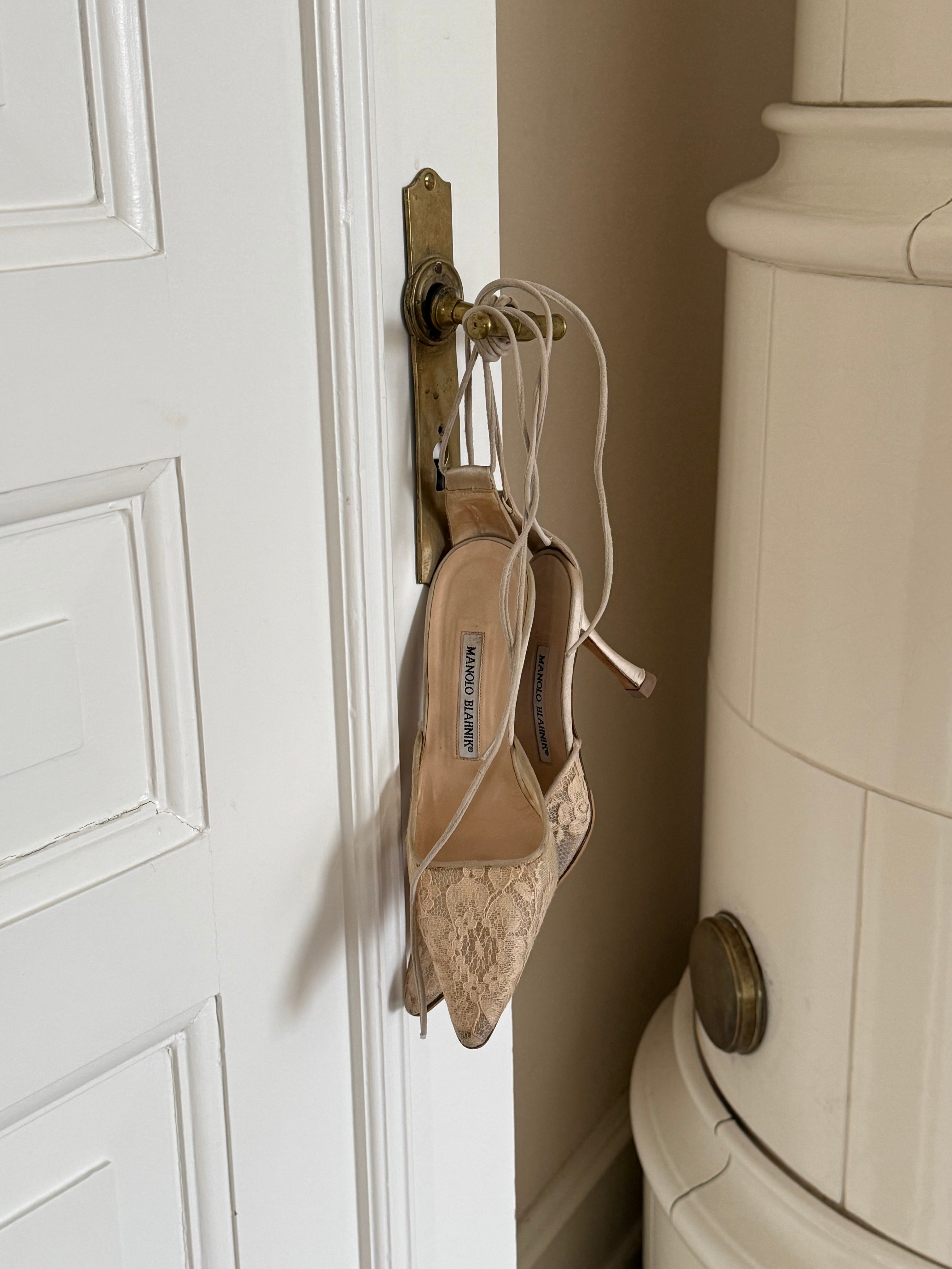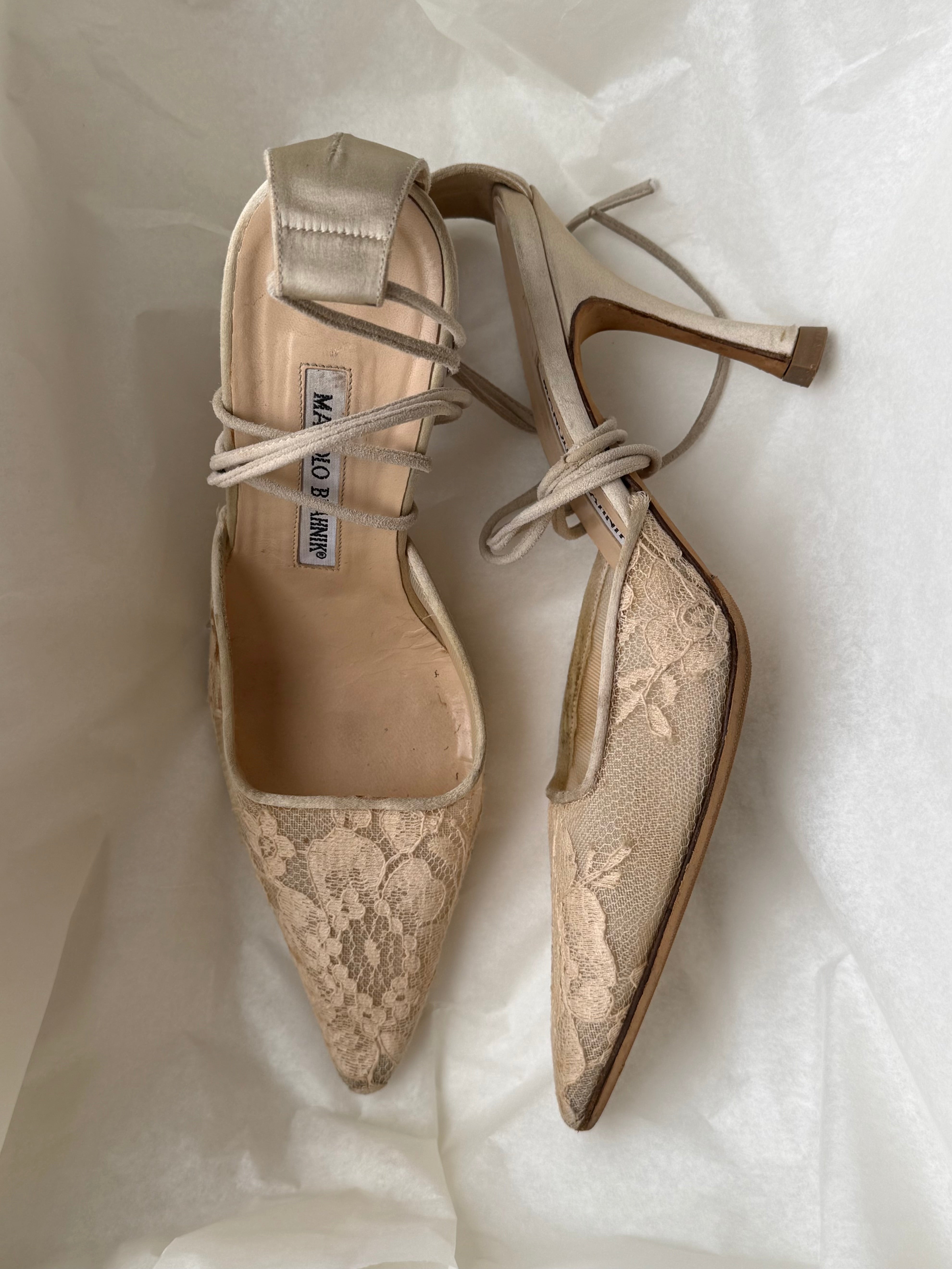 Beautiful vintage Manolo Blahnik lace heels with pointed toe and ankle tie detail.
