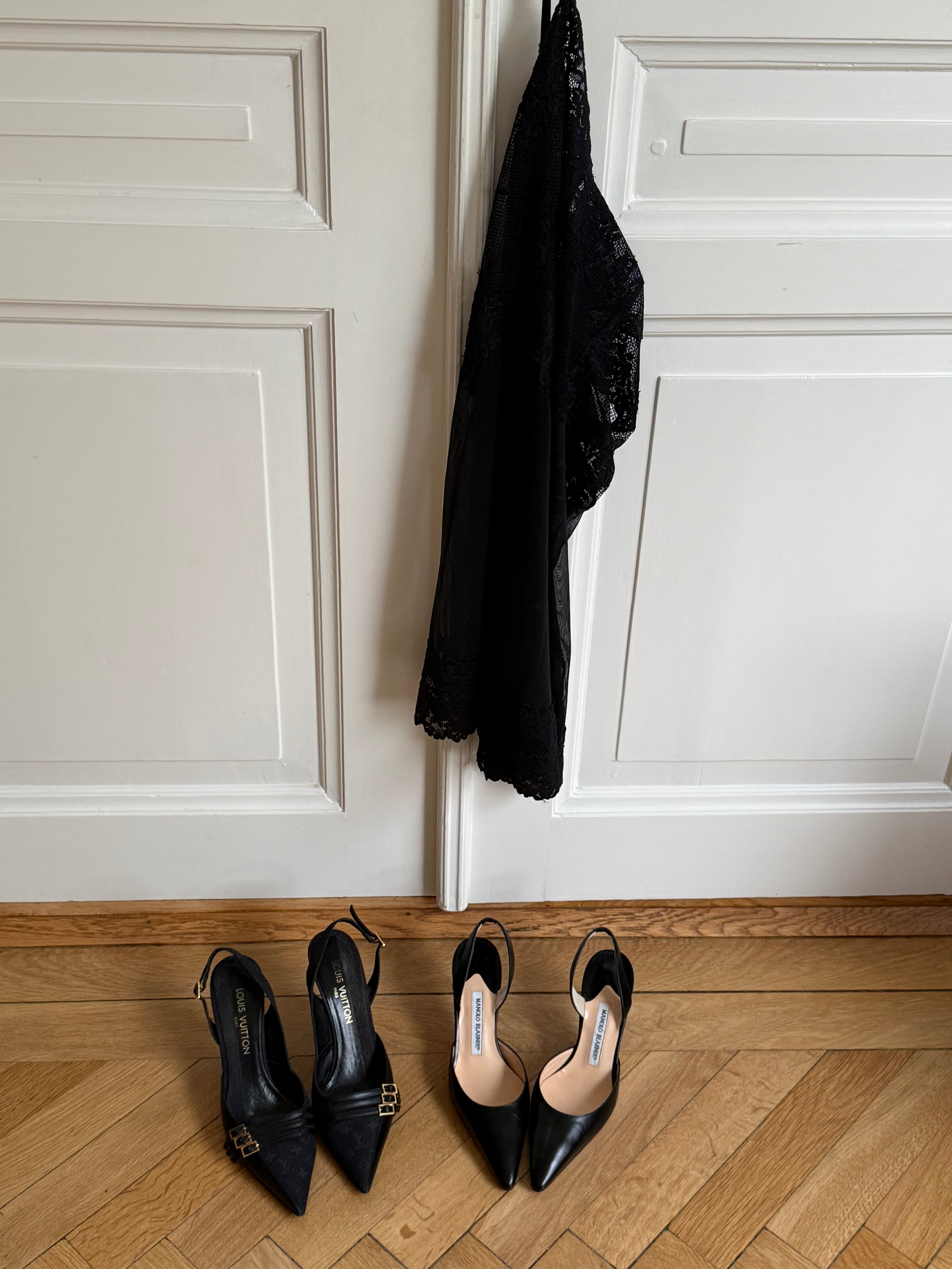 Iconic Manolo Blahnik ‘Carolyne’ pointed toe slingbacks in black leather.
