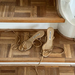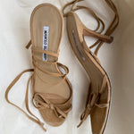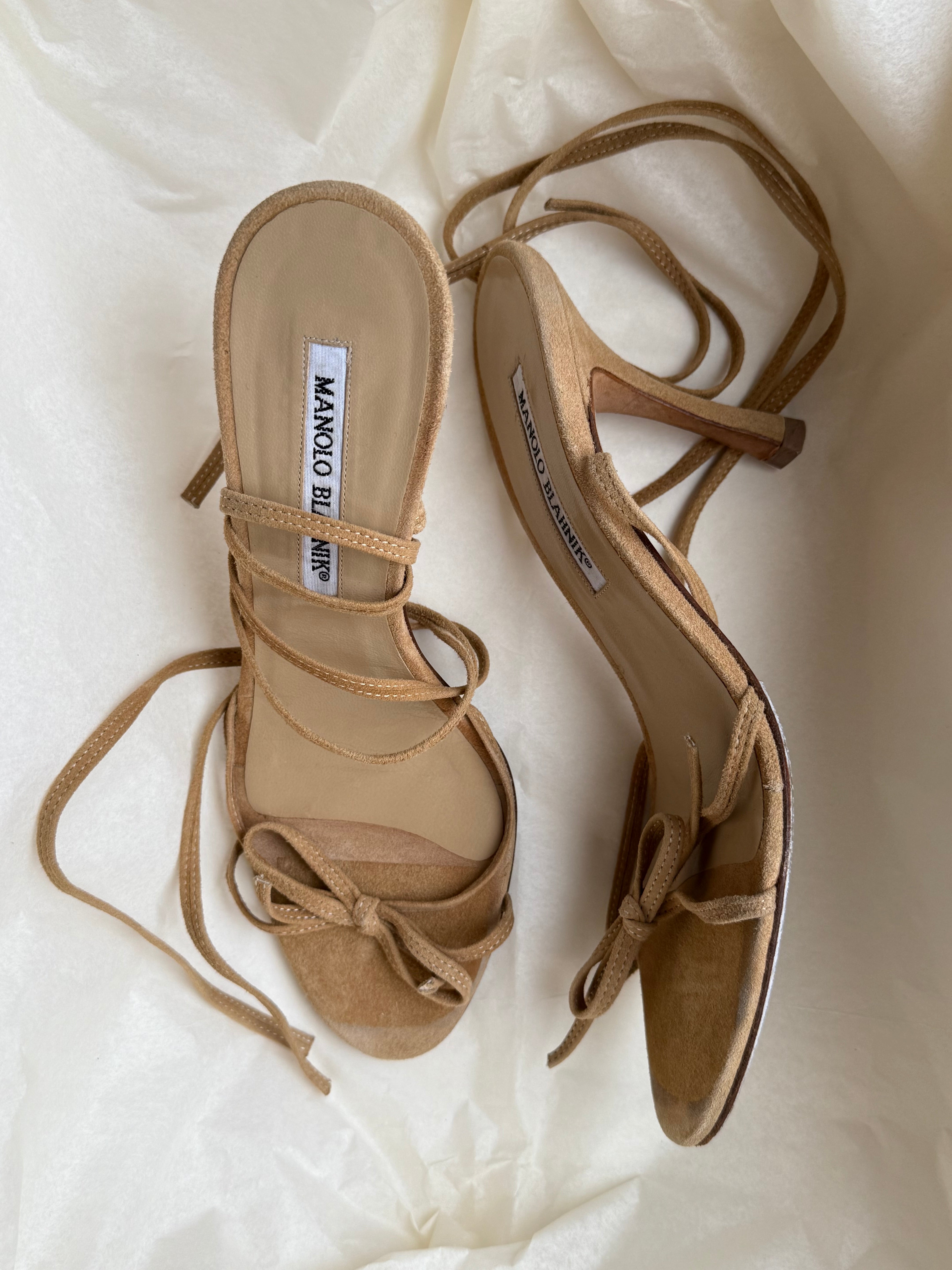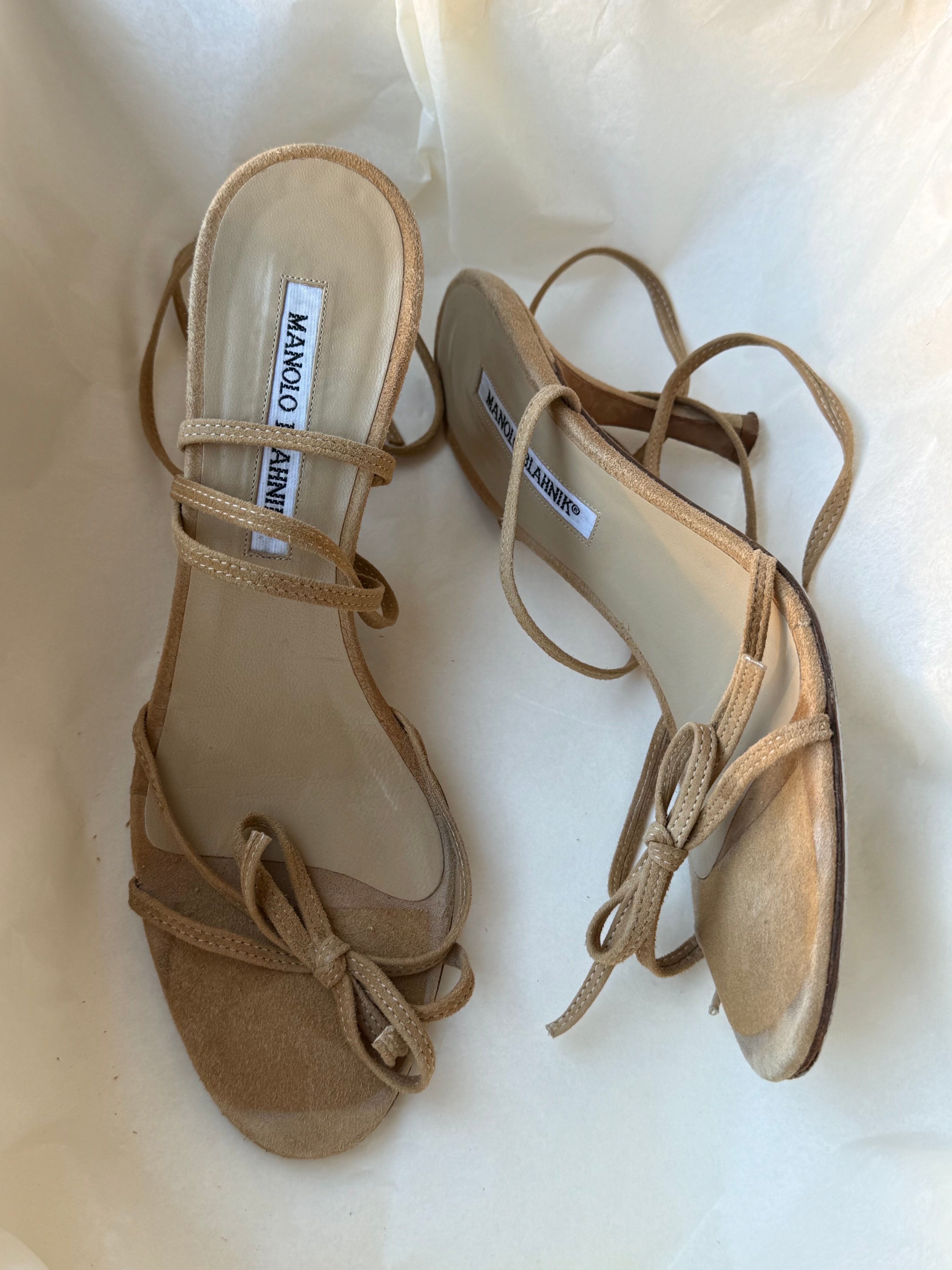 Vintage Manolo Blahnik suede lace-up sandals in camel with bow detailing and long wrap-around straps. From the early 2000s.
