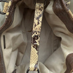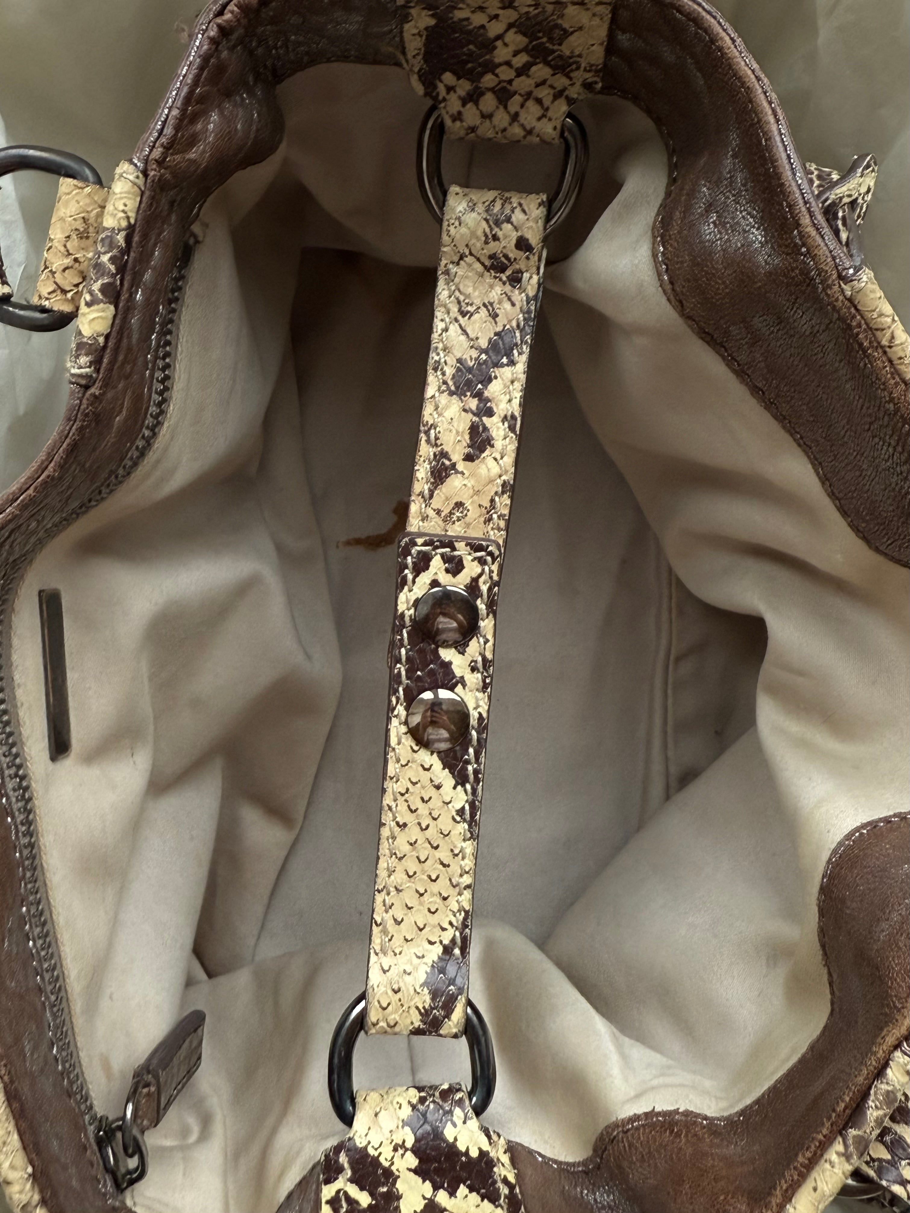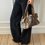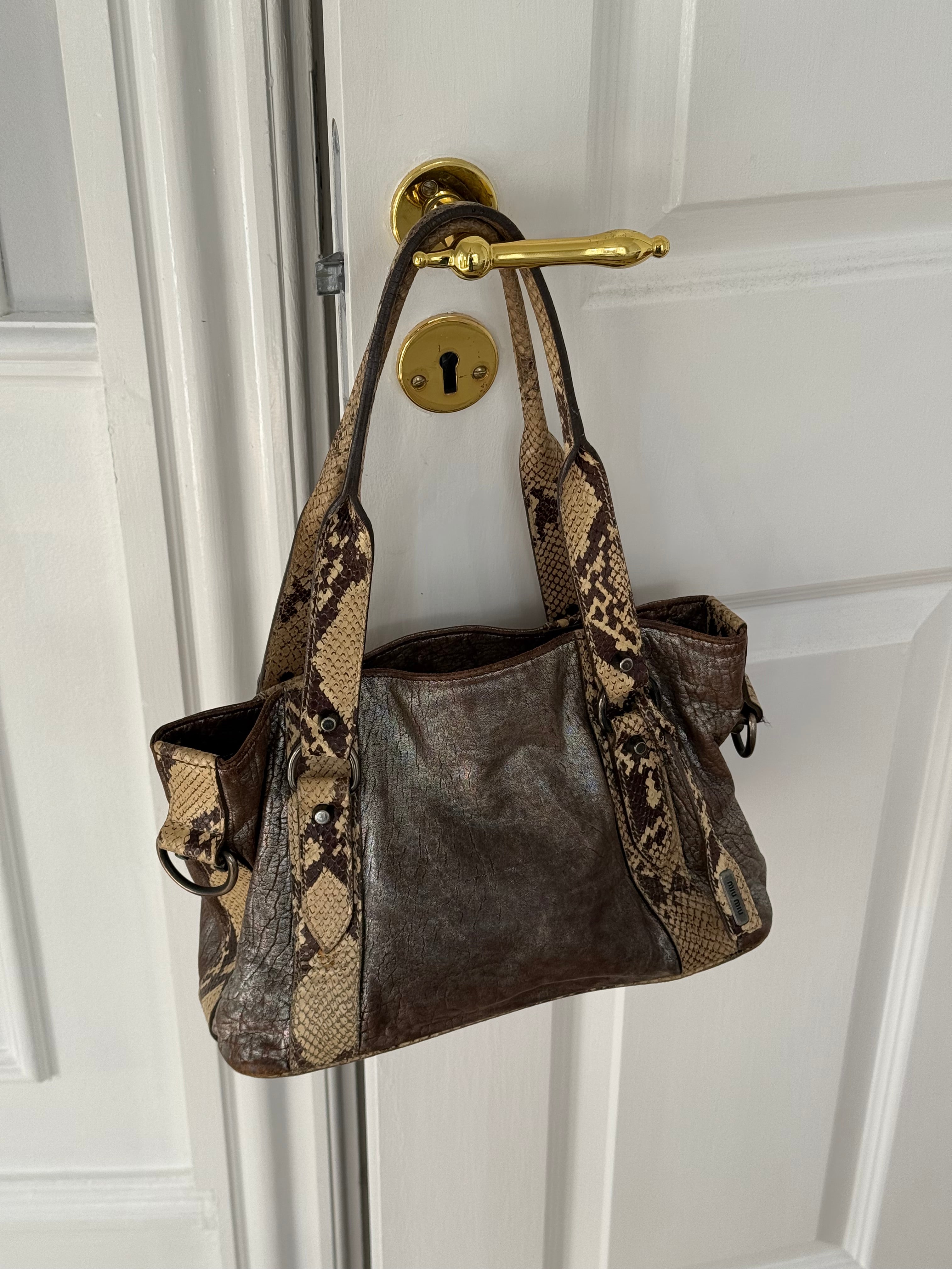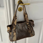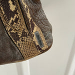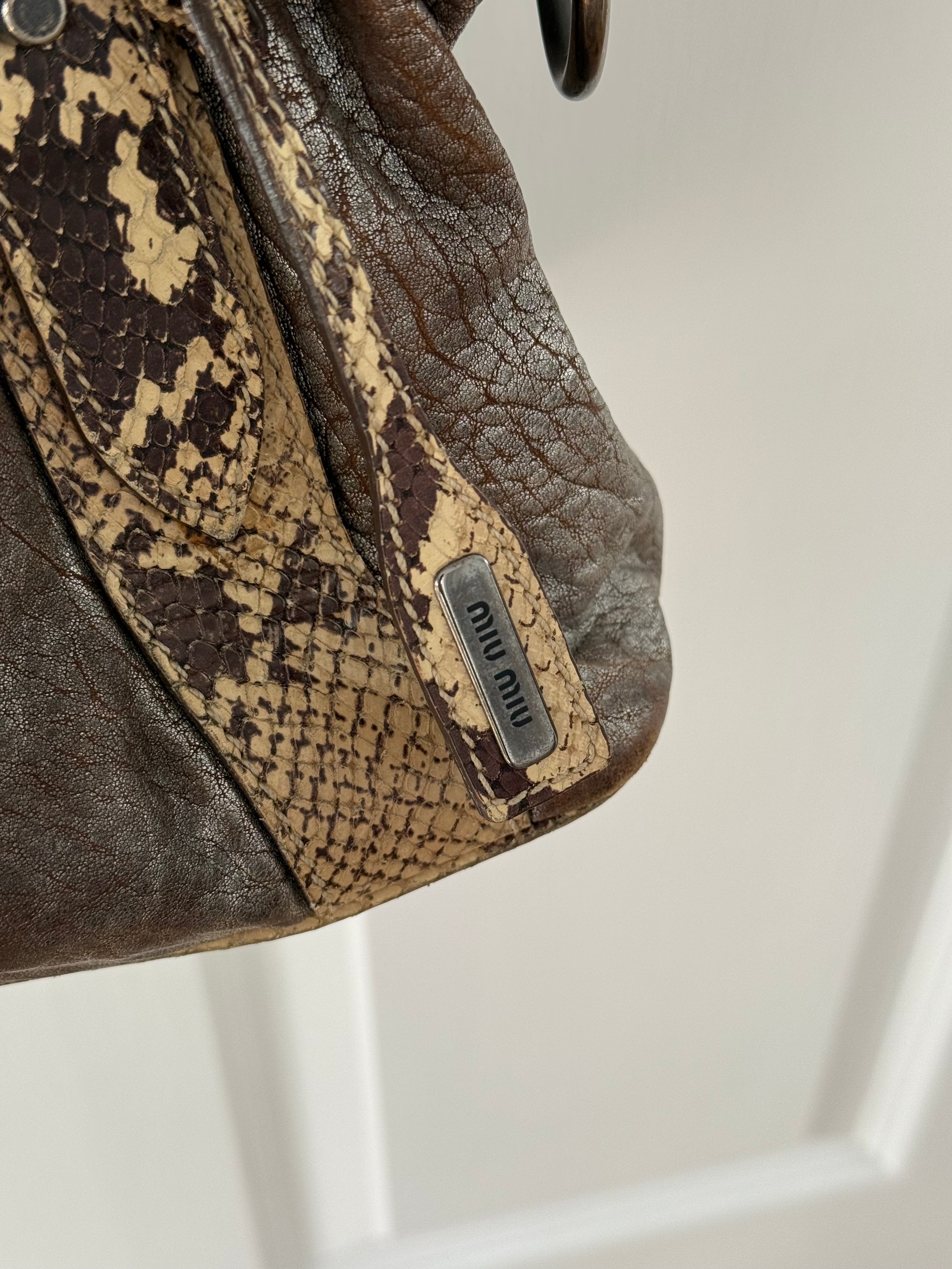 Rare archive Miu Miu bag crafted from brown-grey metallic leather with yellow-toned snakeskin handles and trim. Features silver-tone hardware, double top handles, and a spacious interior.