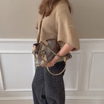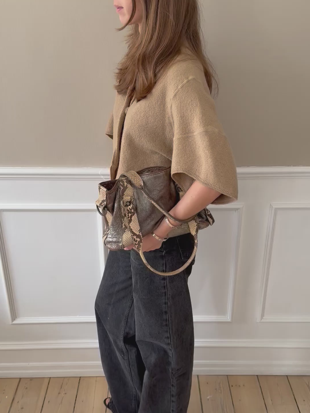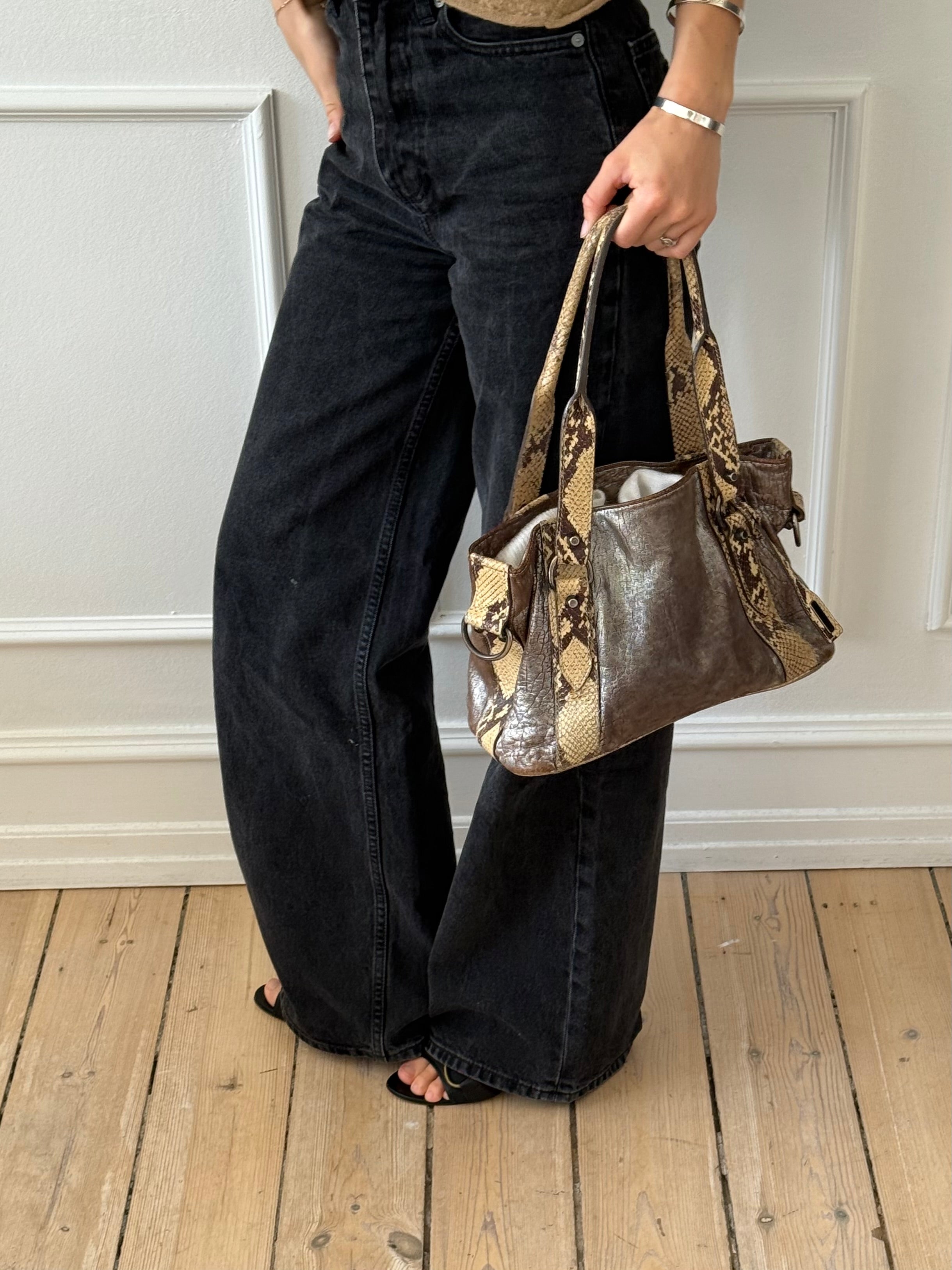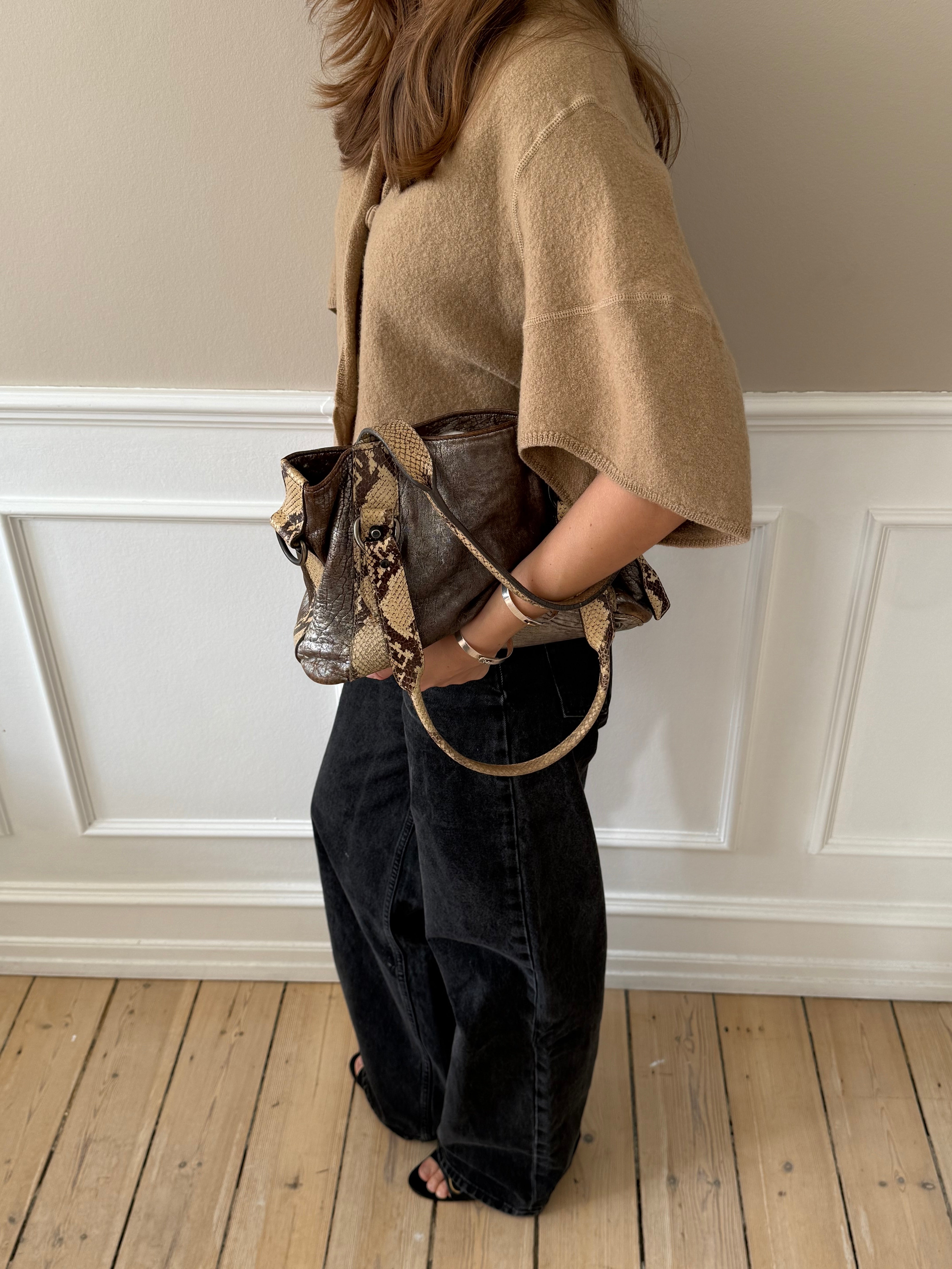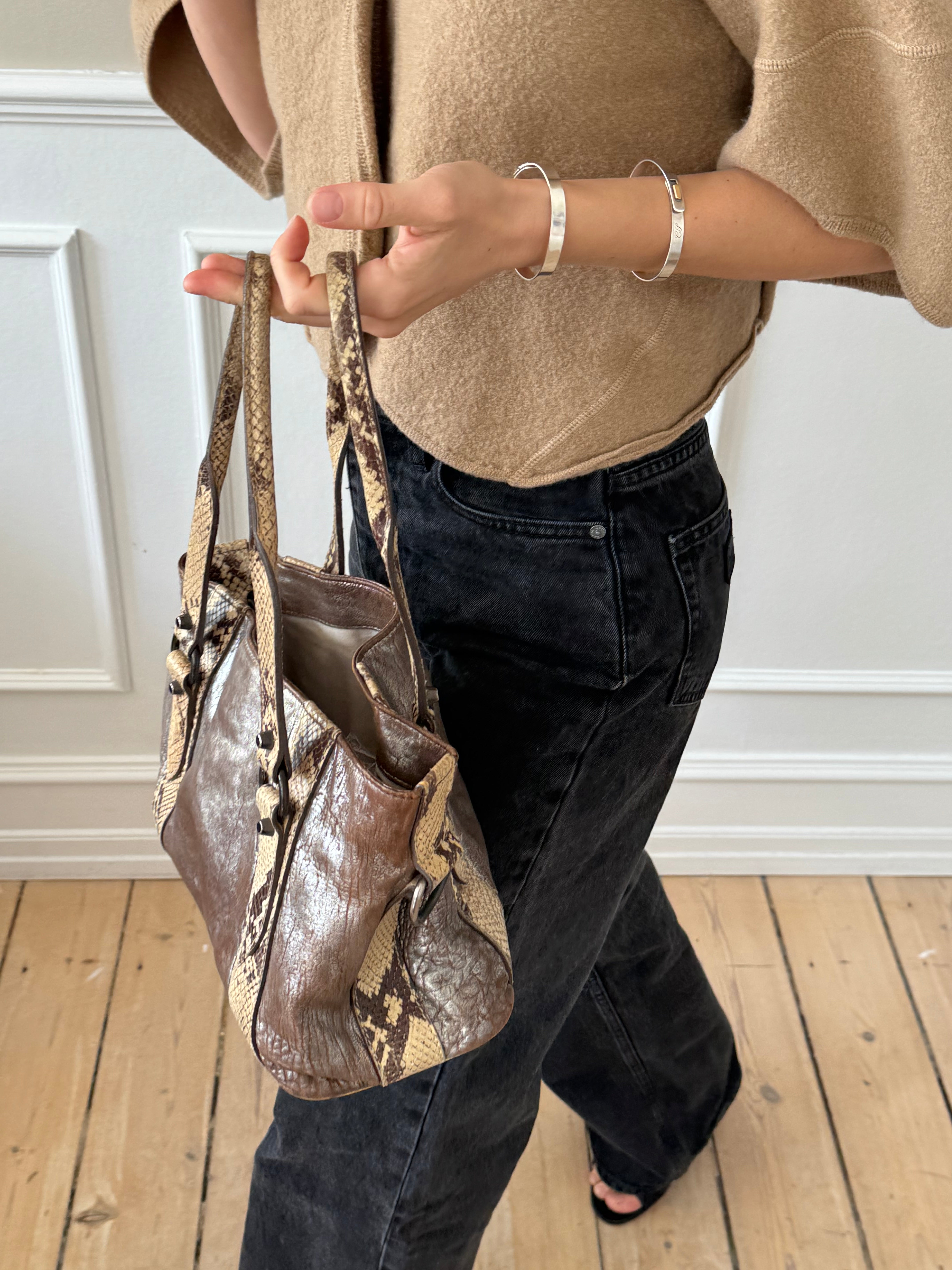 Rare archive Miu Miu bag crafted from brown-grey metallic leather with yellow-toned snakeskin handles and trim. Features silver-tone hardware, double top handles, and a spacious interior.