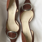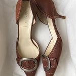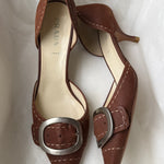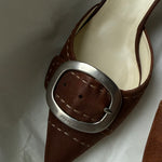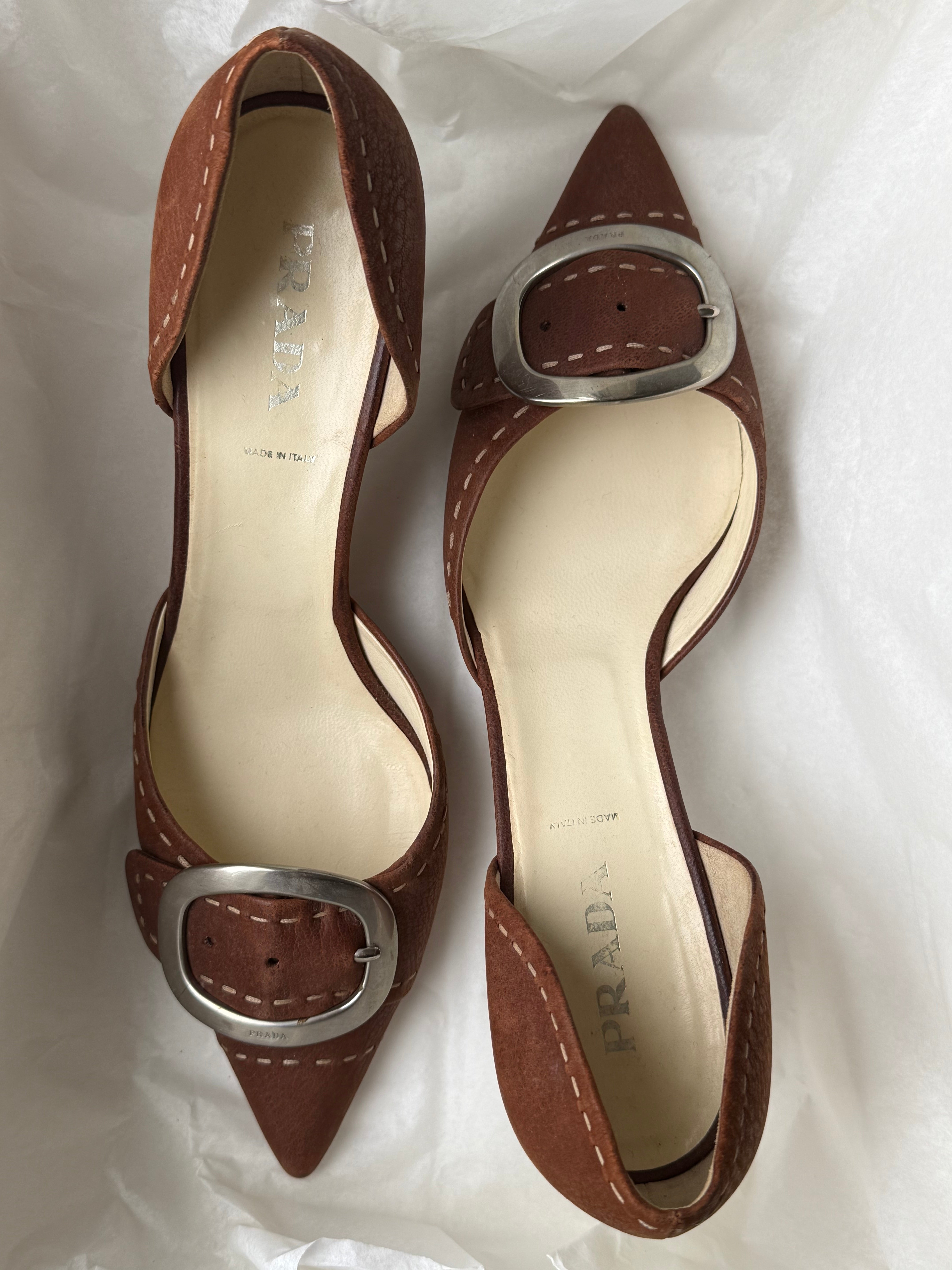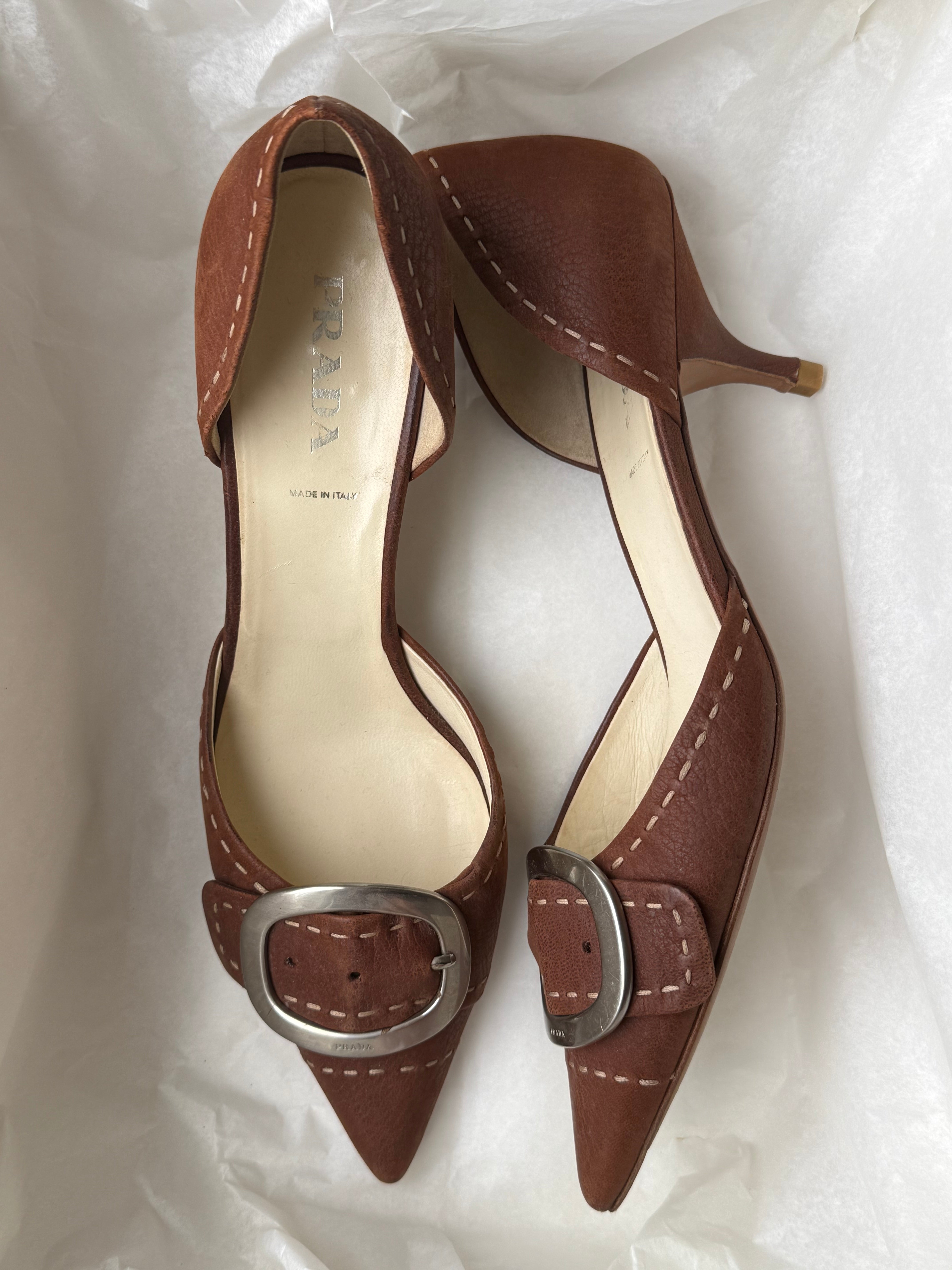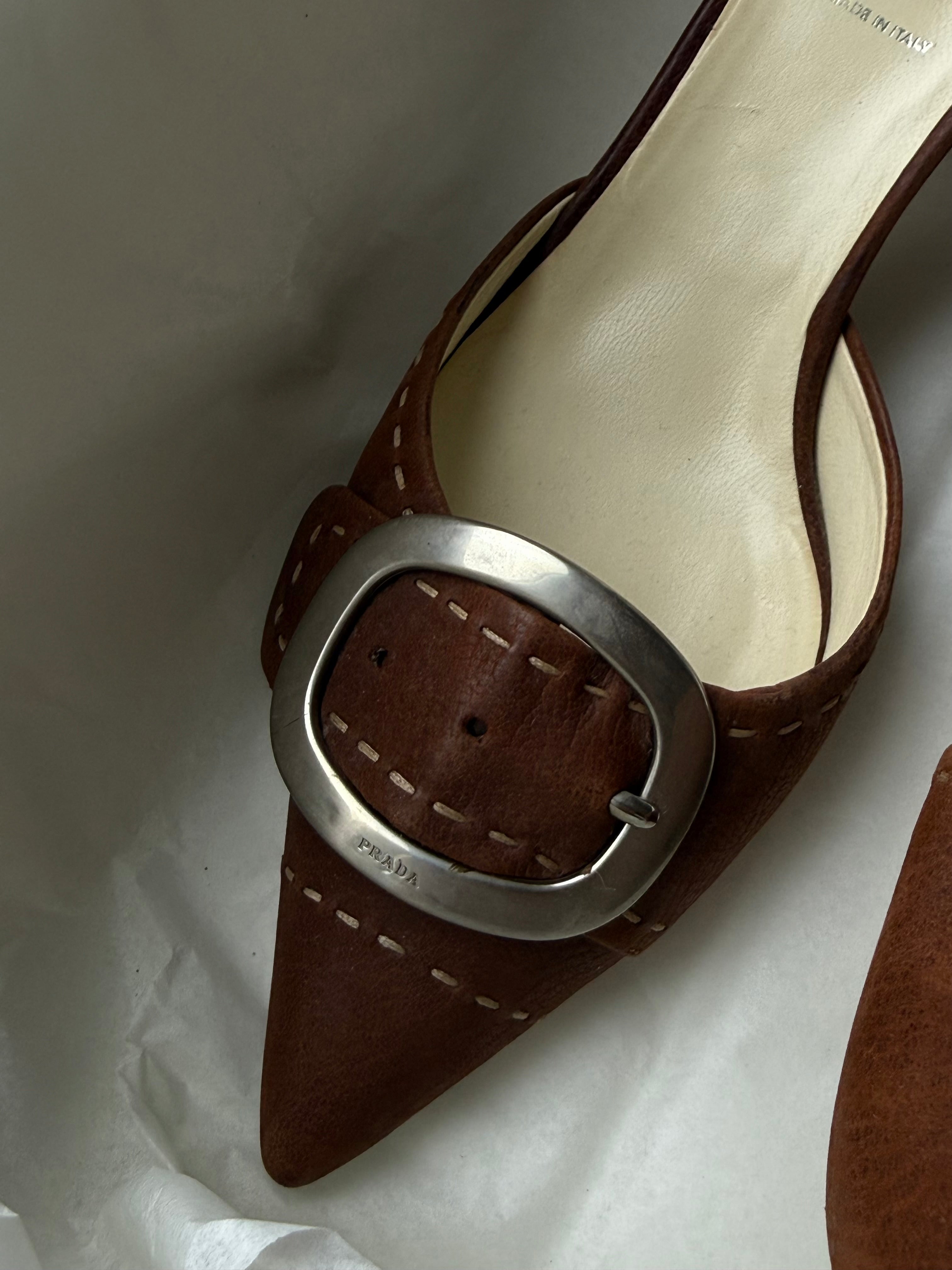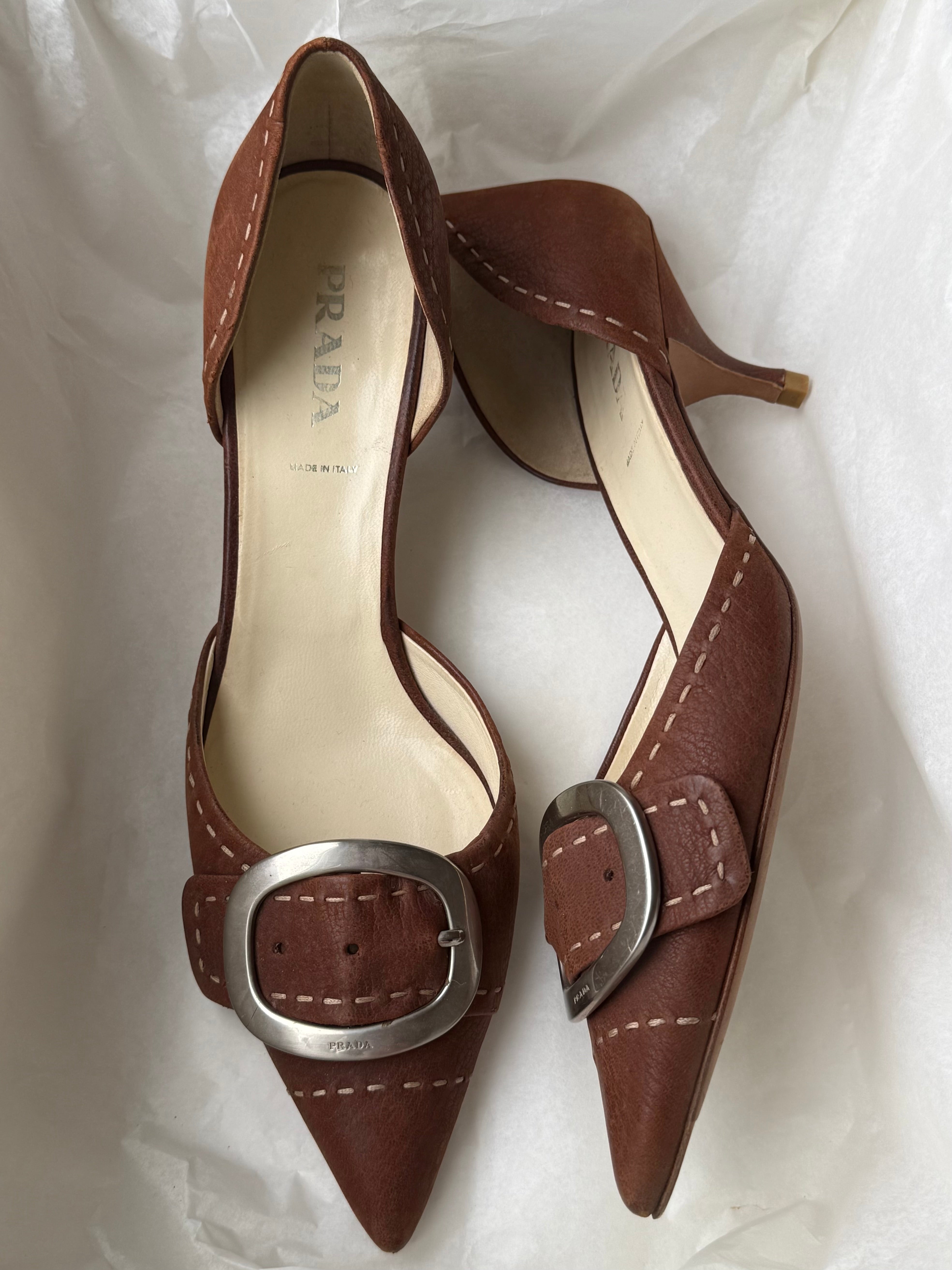 Vintage Prada heels in brown with a pointed toe, statement buckle detail, and contrast stitching.