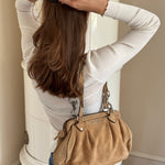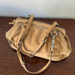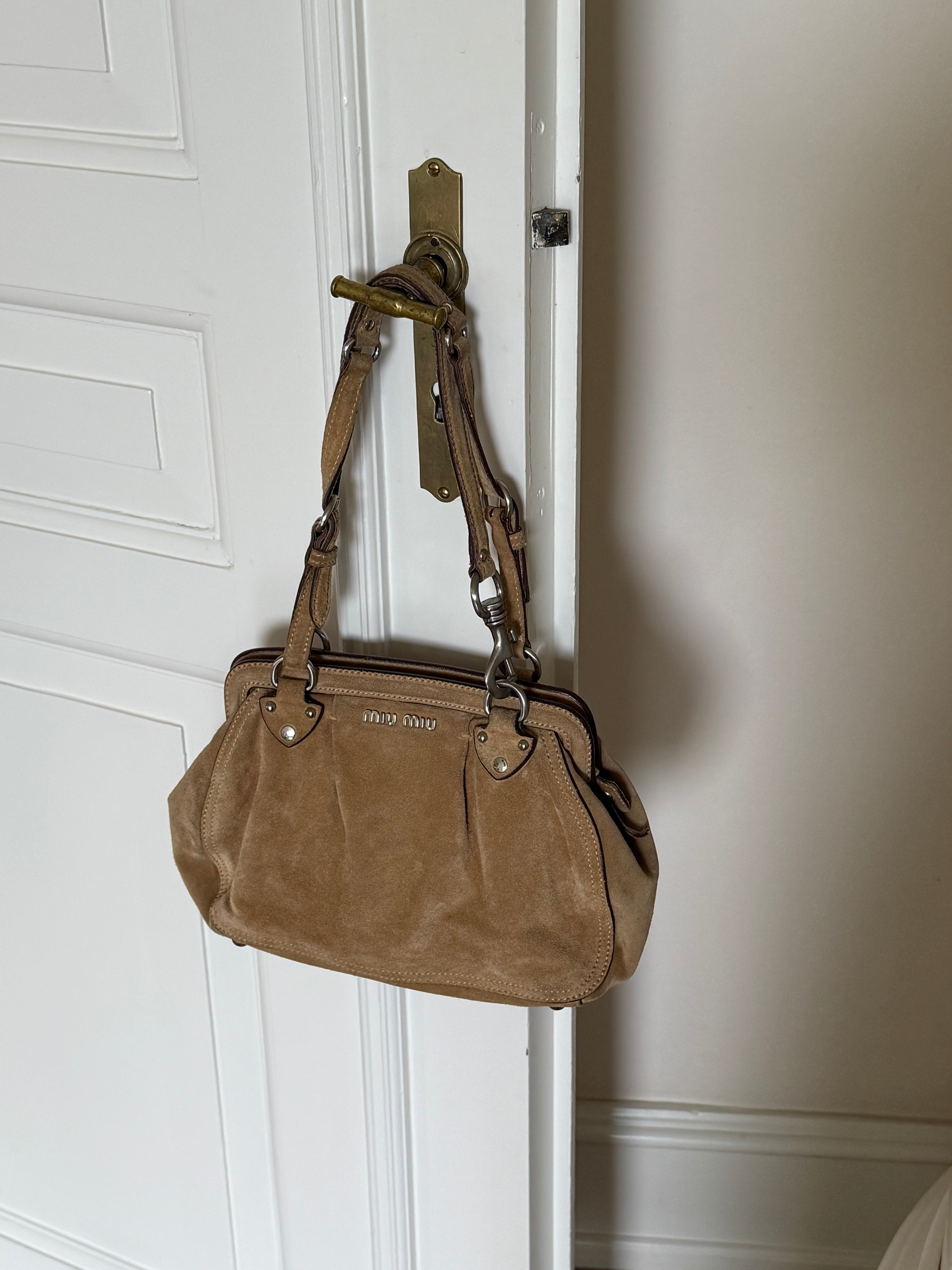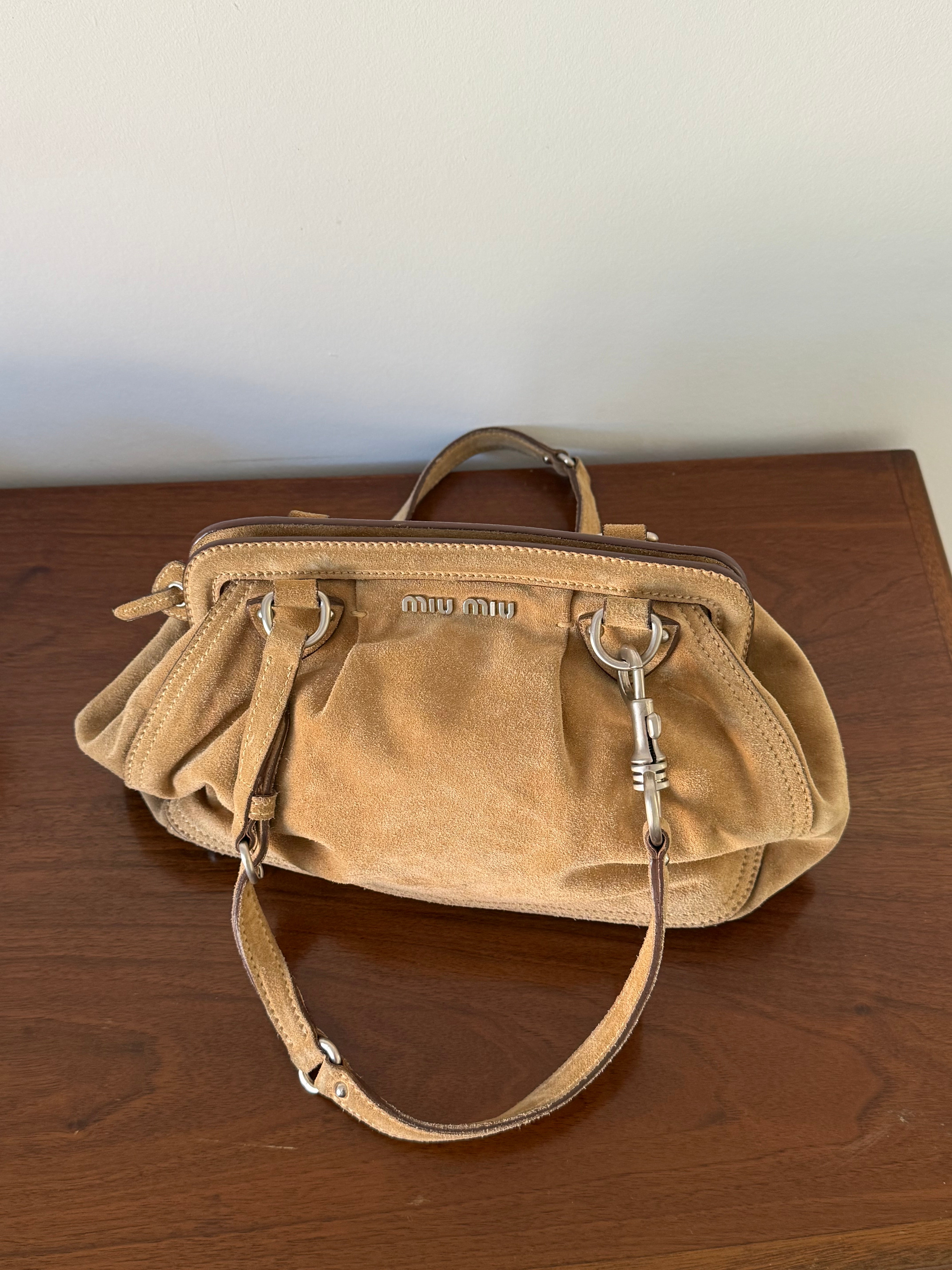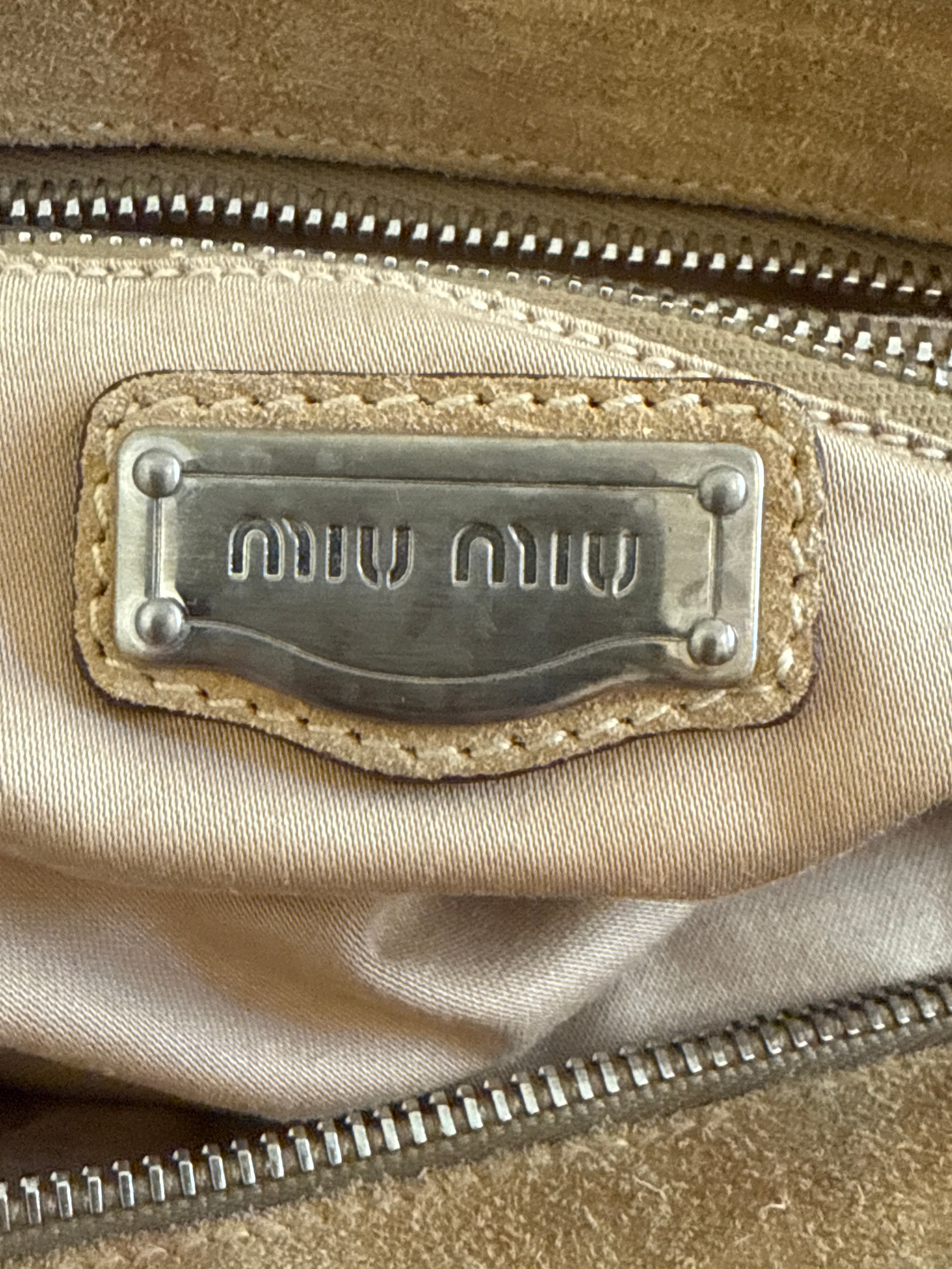 Beautiful rare vintage Miu Miu suede shoulder bag with silver-tone hardware. Designed with two adjustable shoulder straps, a secure top zip closure, and a spacious main compartment with an interior zip pocket.