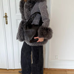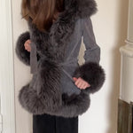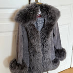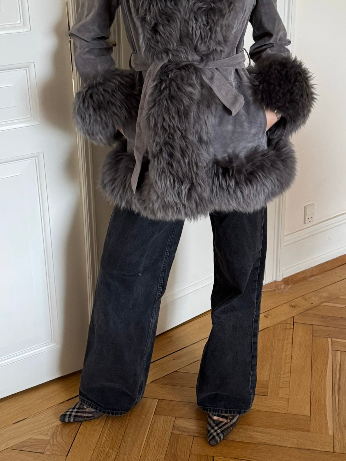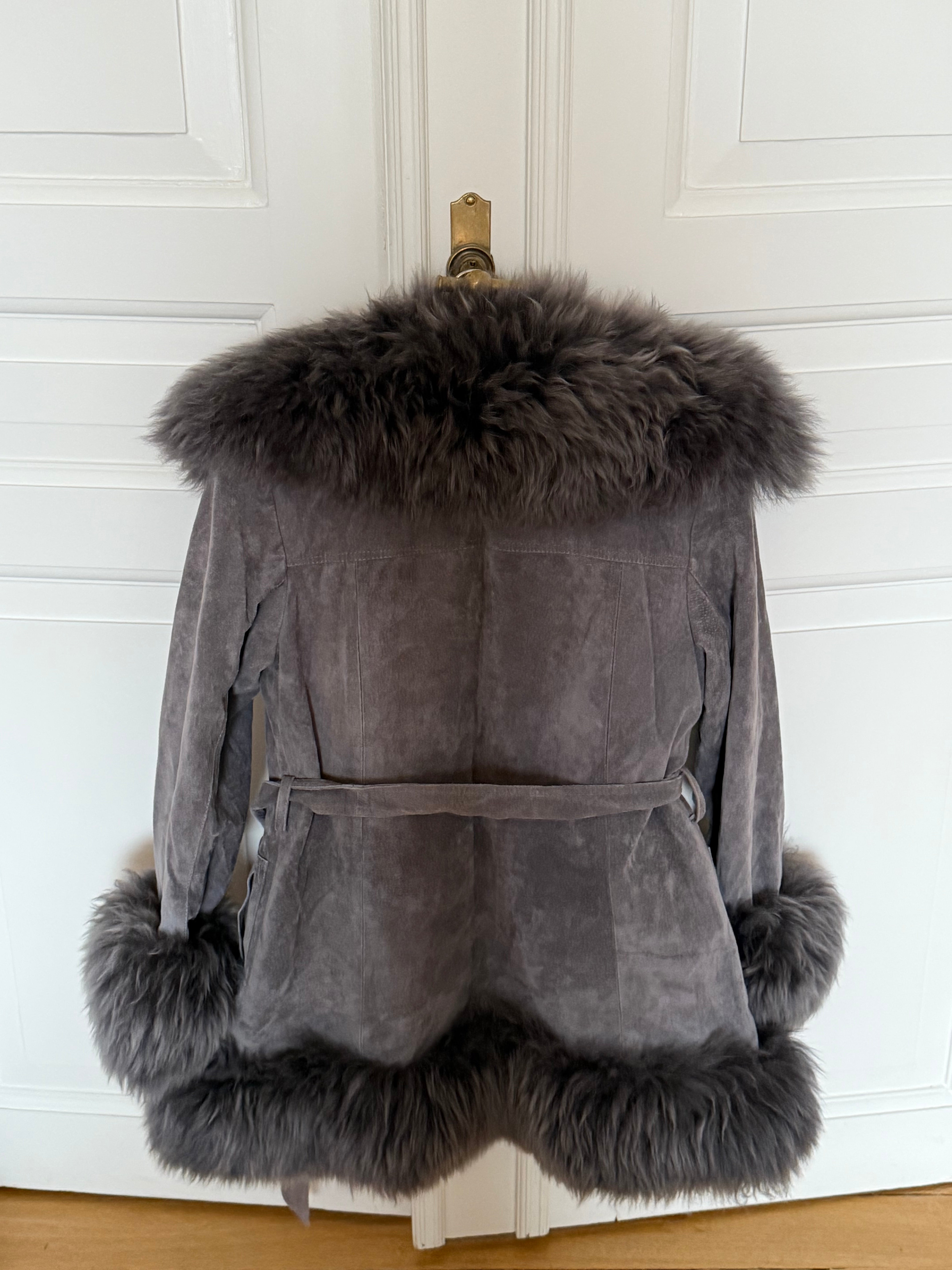 Beautiful warm suede jacket featuring fur trim and a matching tie belt that defines the waist. Designed with a soft quilted lining, wide fur cuffs, a dramatic fur collar, and side pockets.