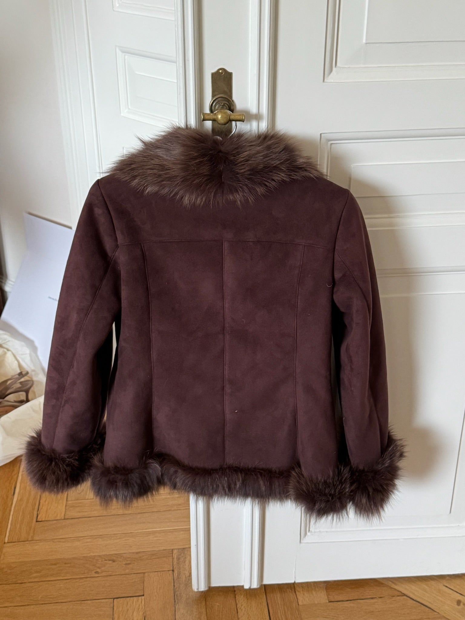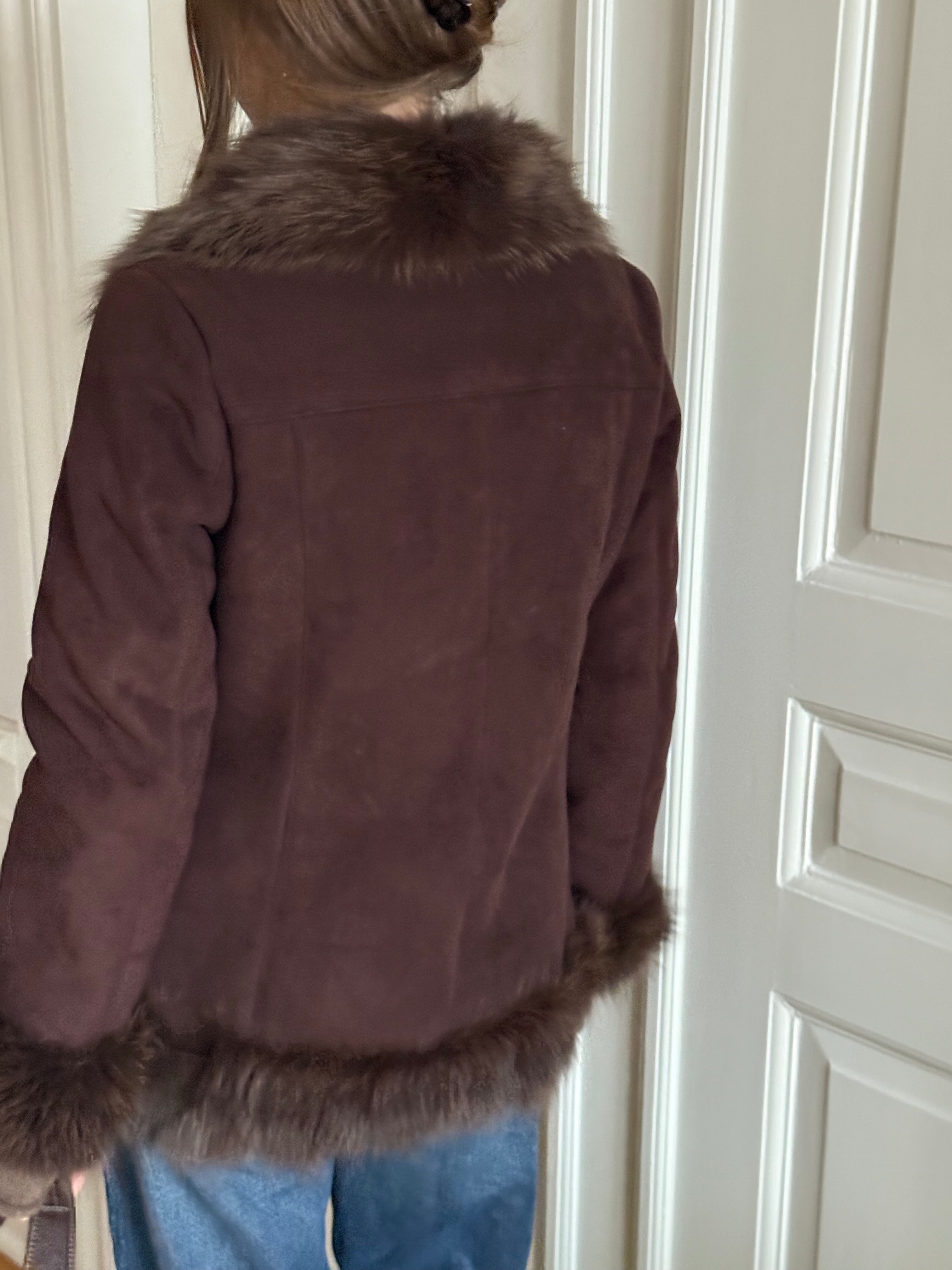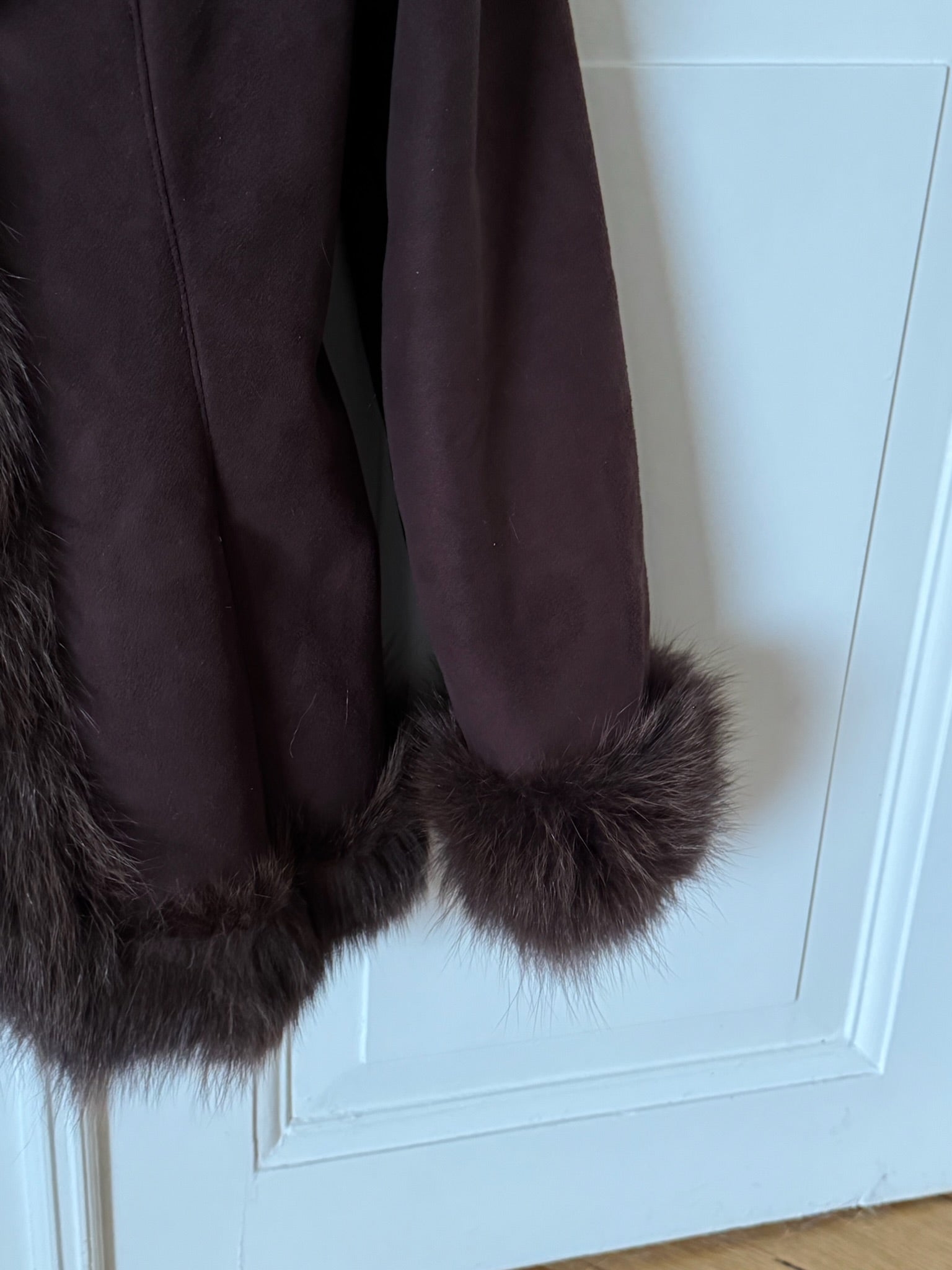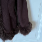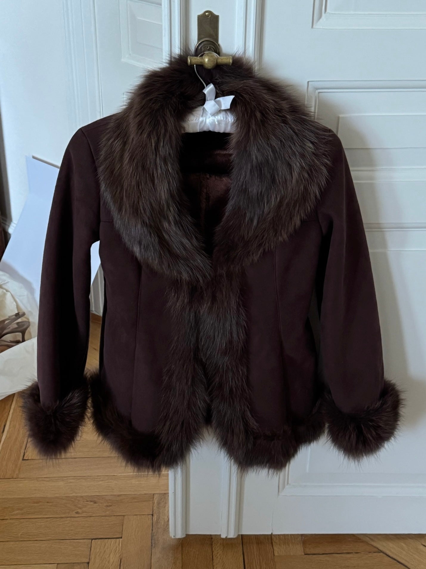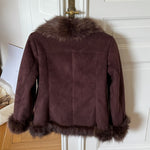 A luxurious vintage brown jacket featuring genuine fox fur along the collar and cuffs. The body of the jacket is crafted from a soft faux-suede exterior with a plush, velvety lining made from an acrylic–polyester blend.