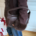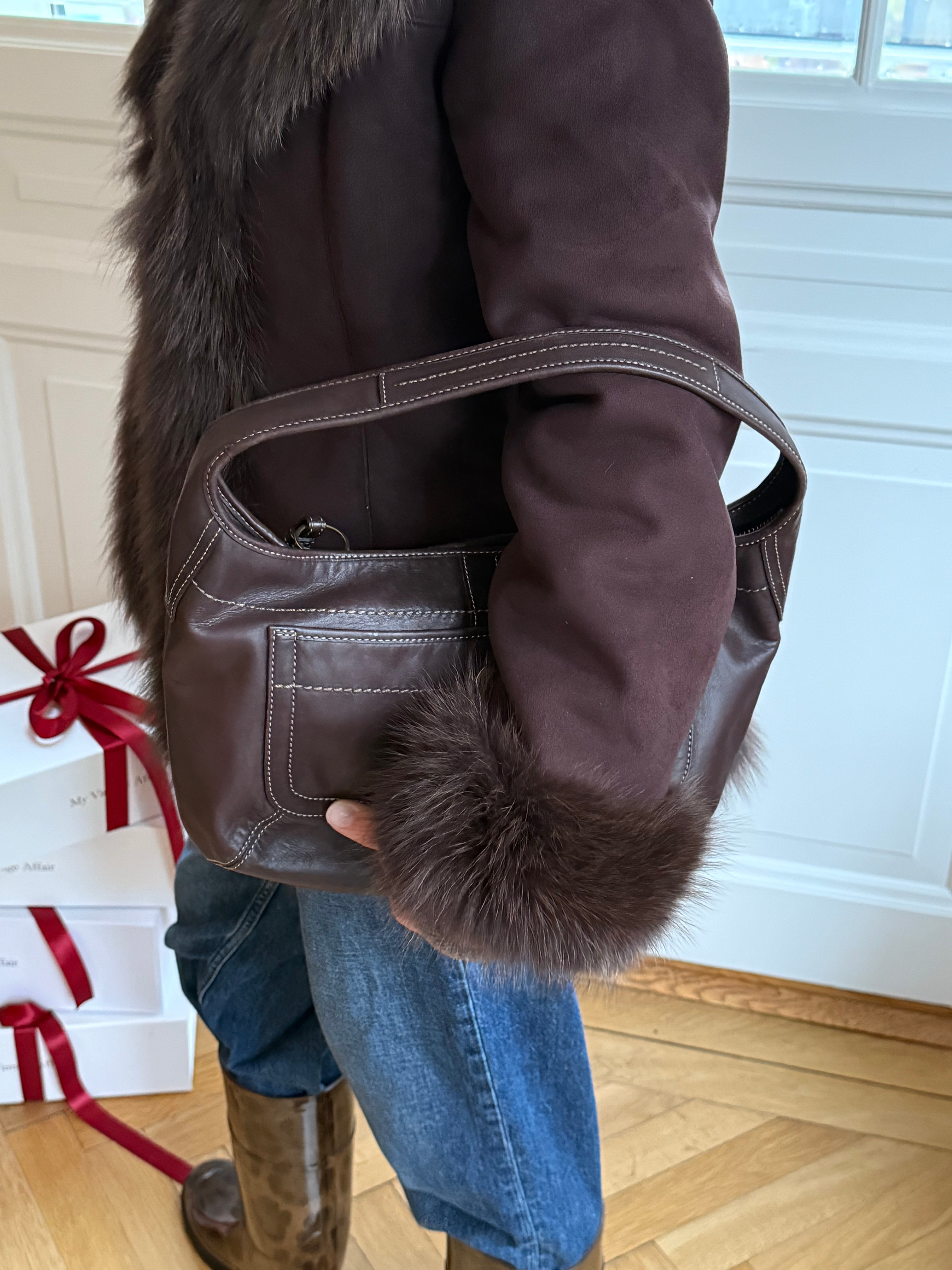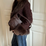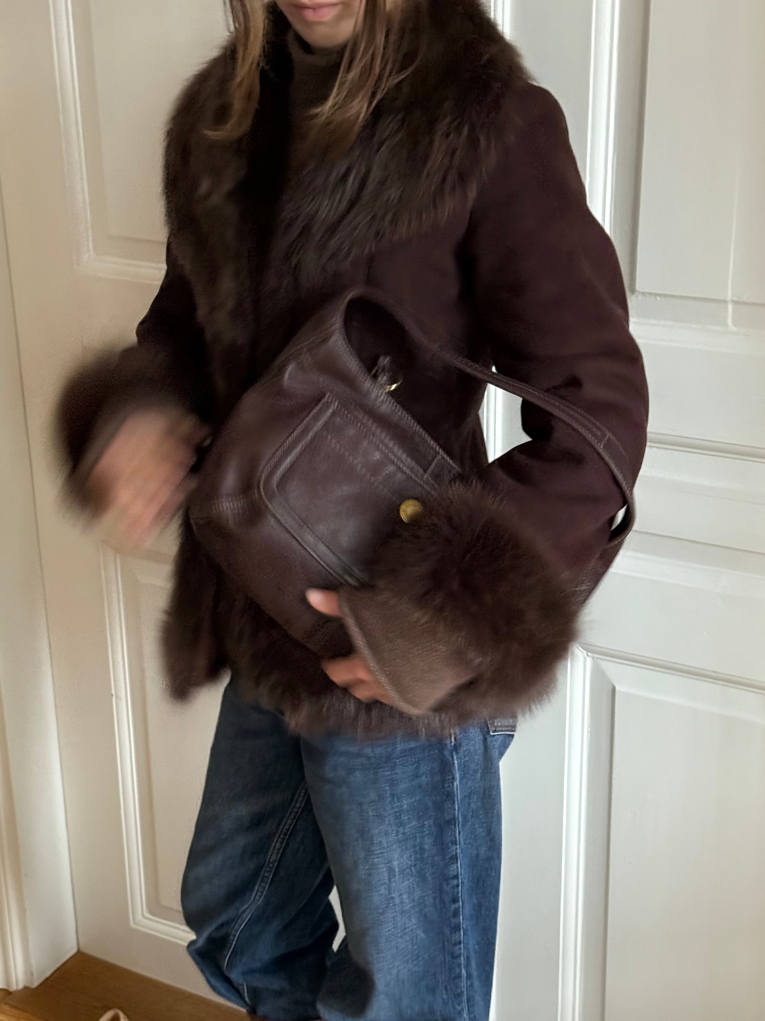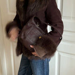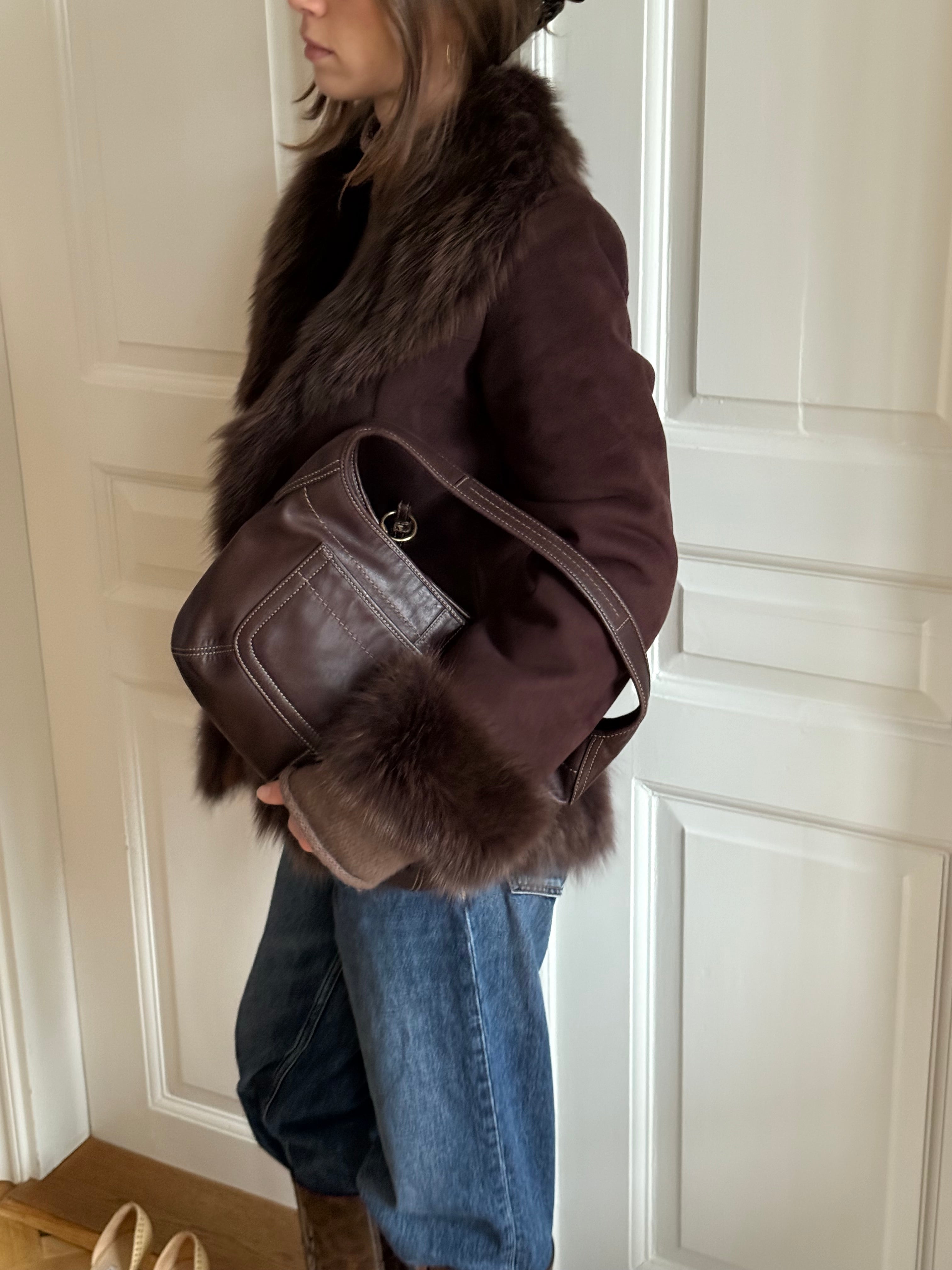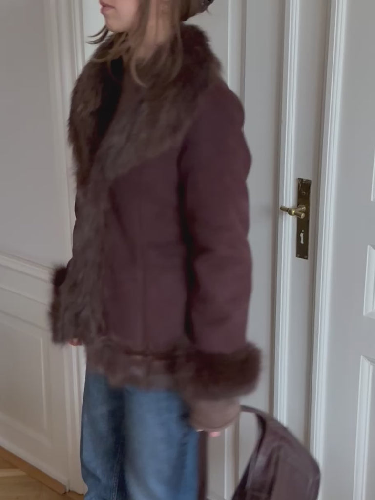 A luxurious vintage brown jacket featuring genuine fox fur along the collar and cuffs. The body of the jacket is crafted from a soft faux-suede exterior with a plush, velvety lining made from an acrylic–polyester blend.