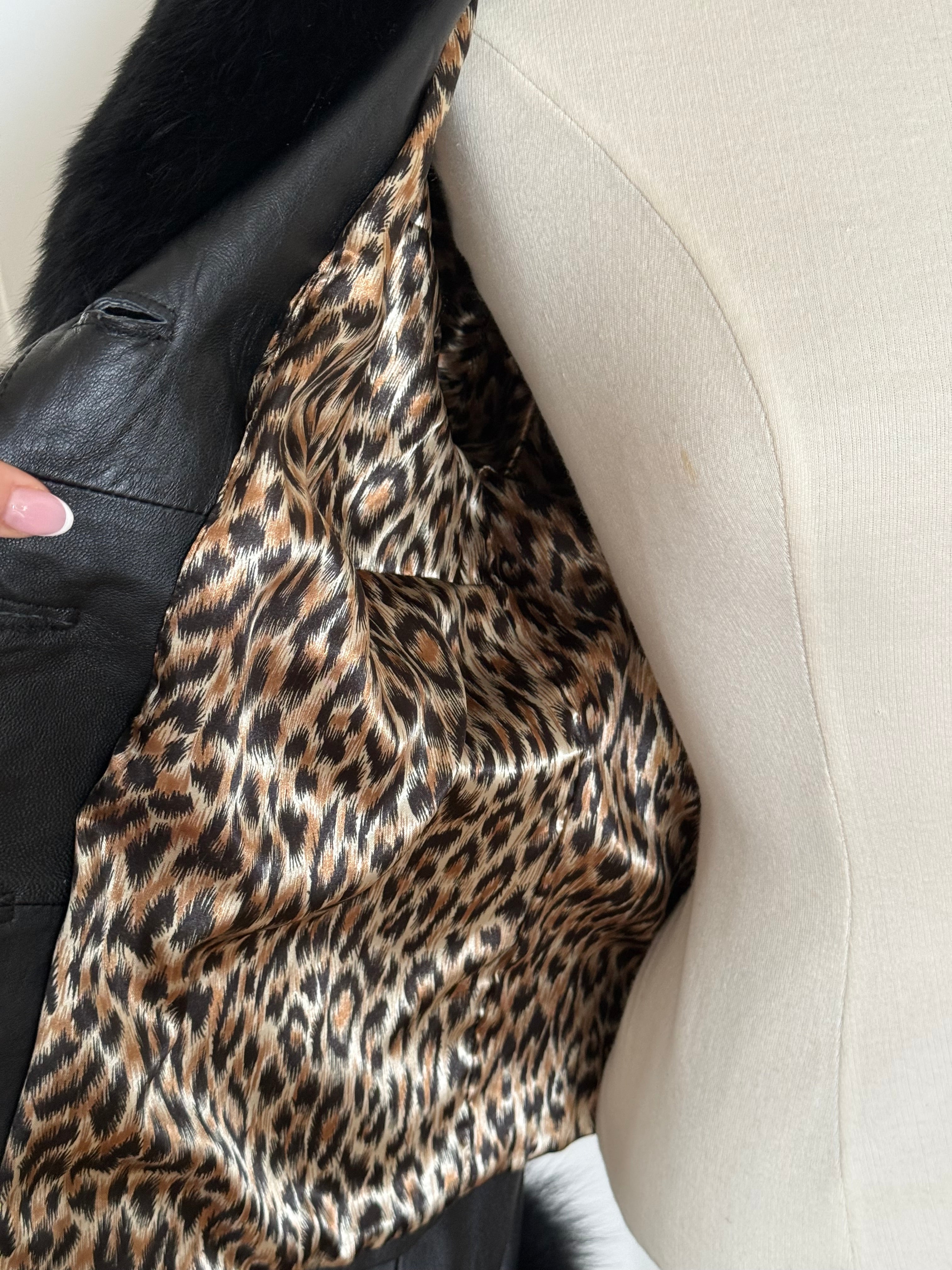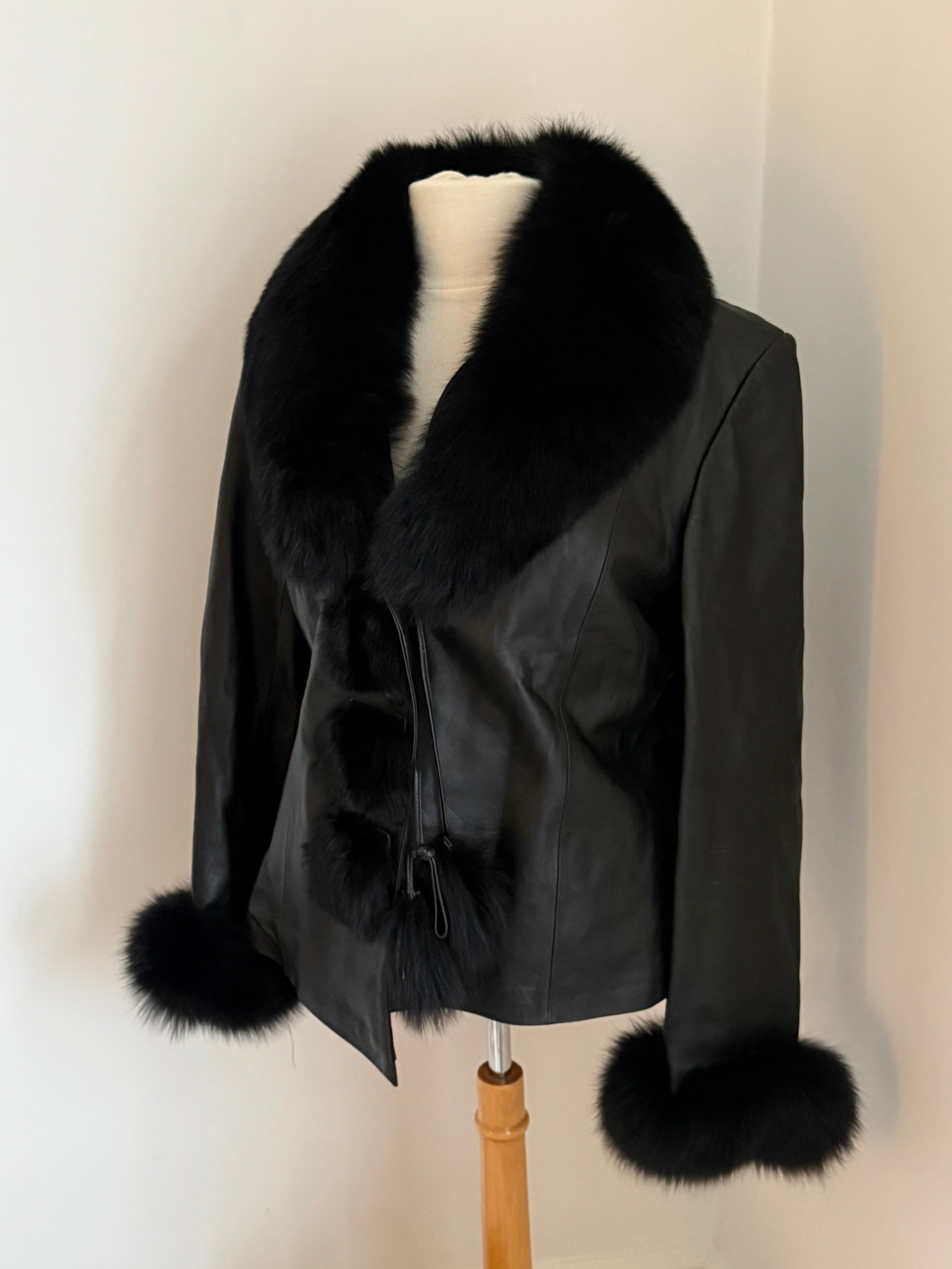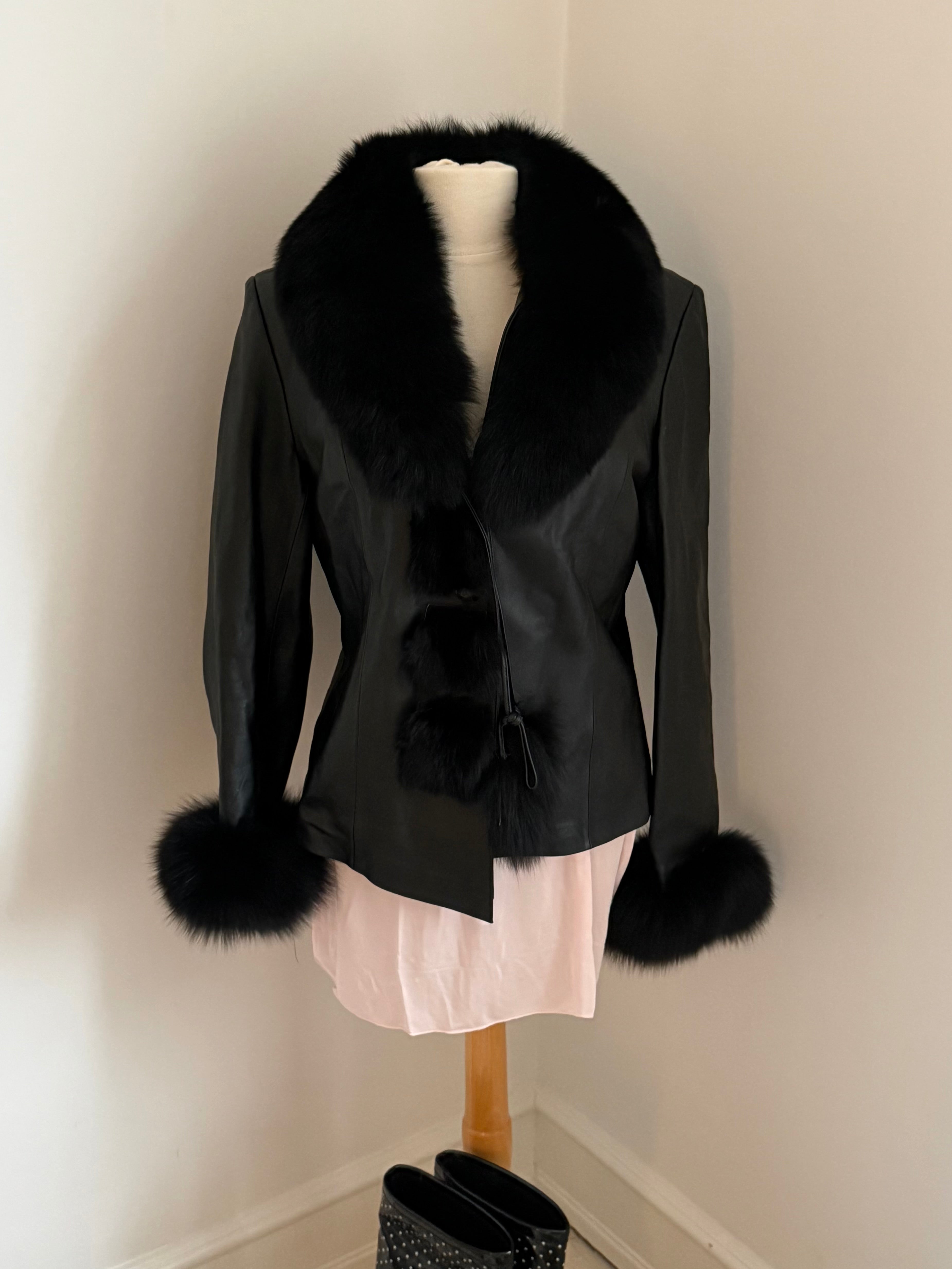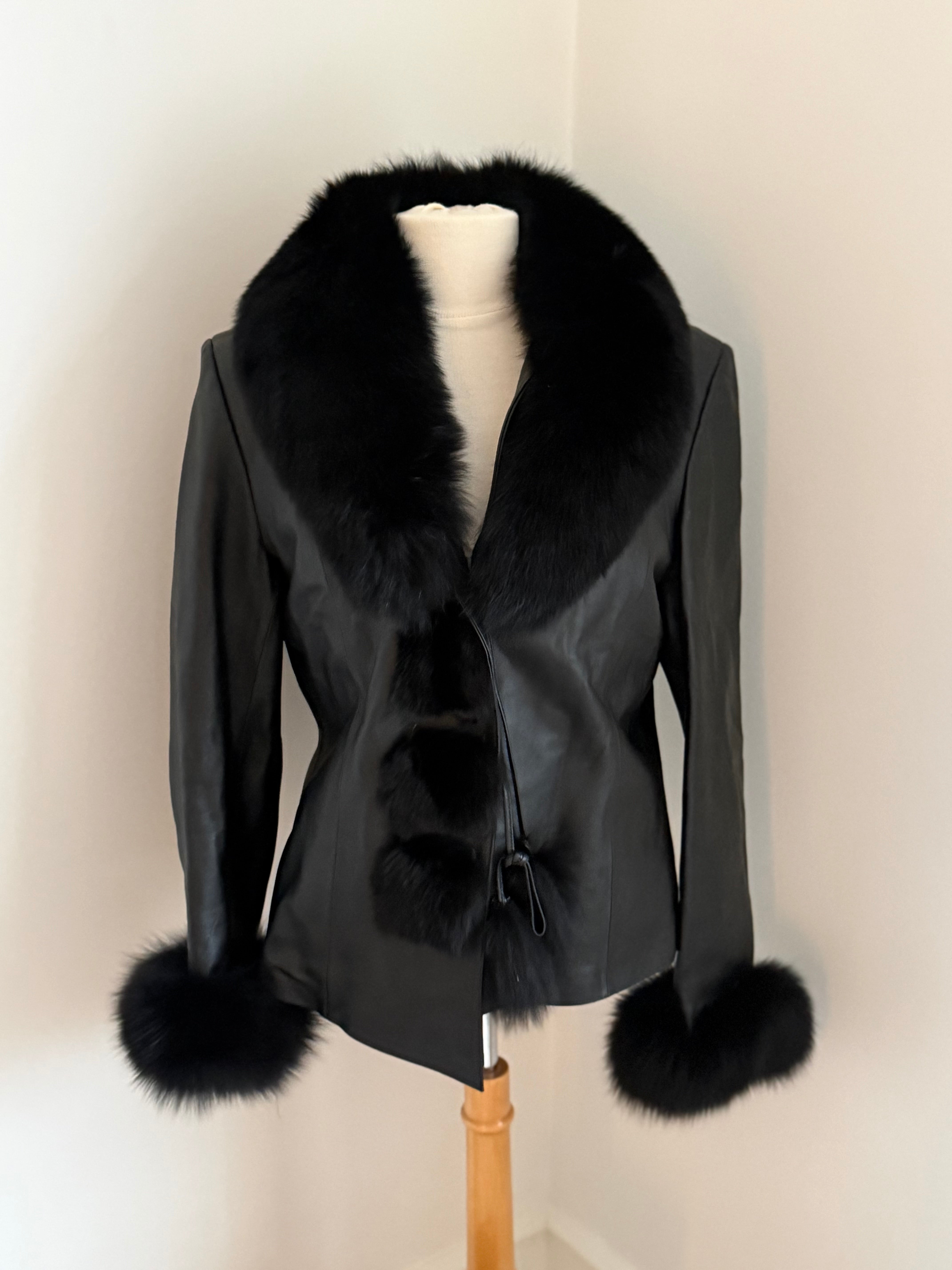 Leather jacket in black leather with fox fur trim at the collar and cuffs. The jacket features an asymmetrical front, button closure and a leopard print lining inside.
