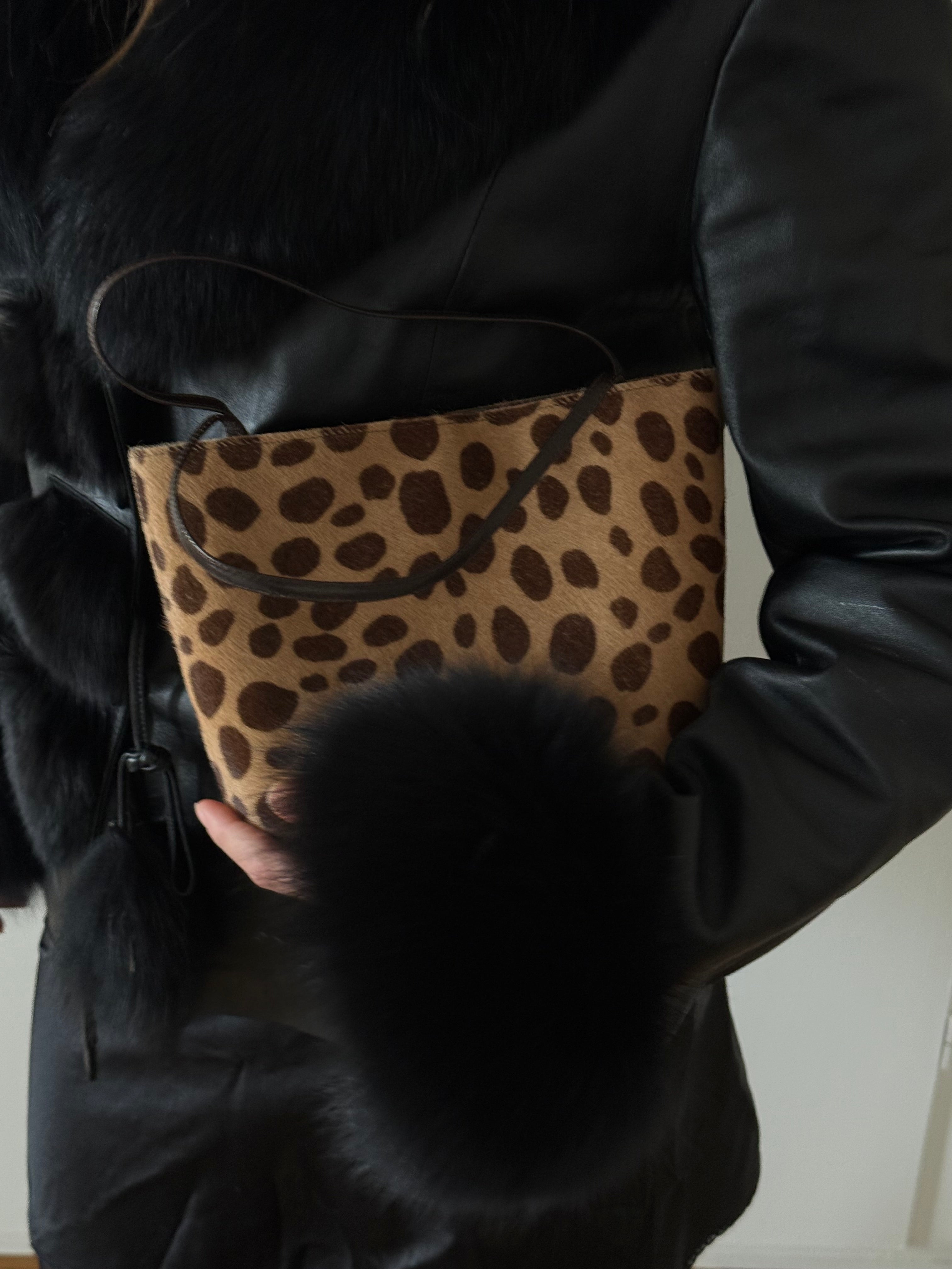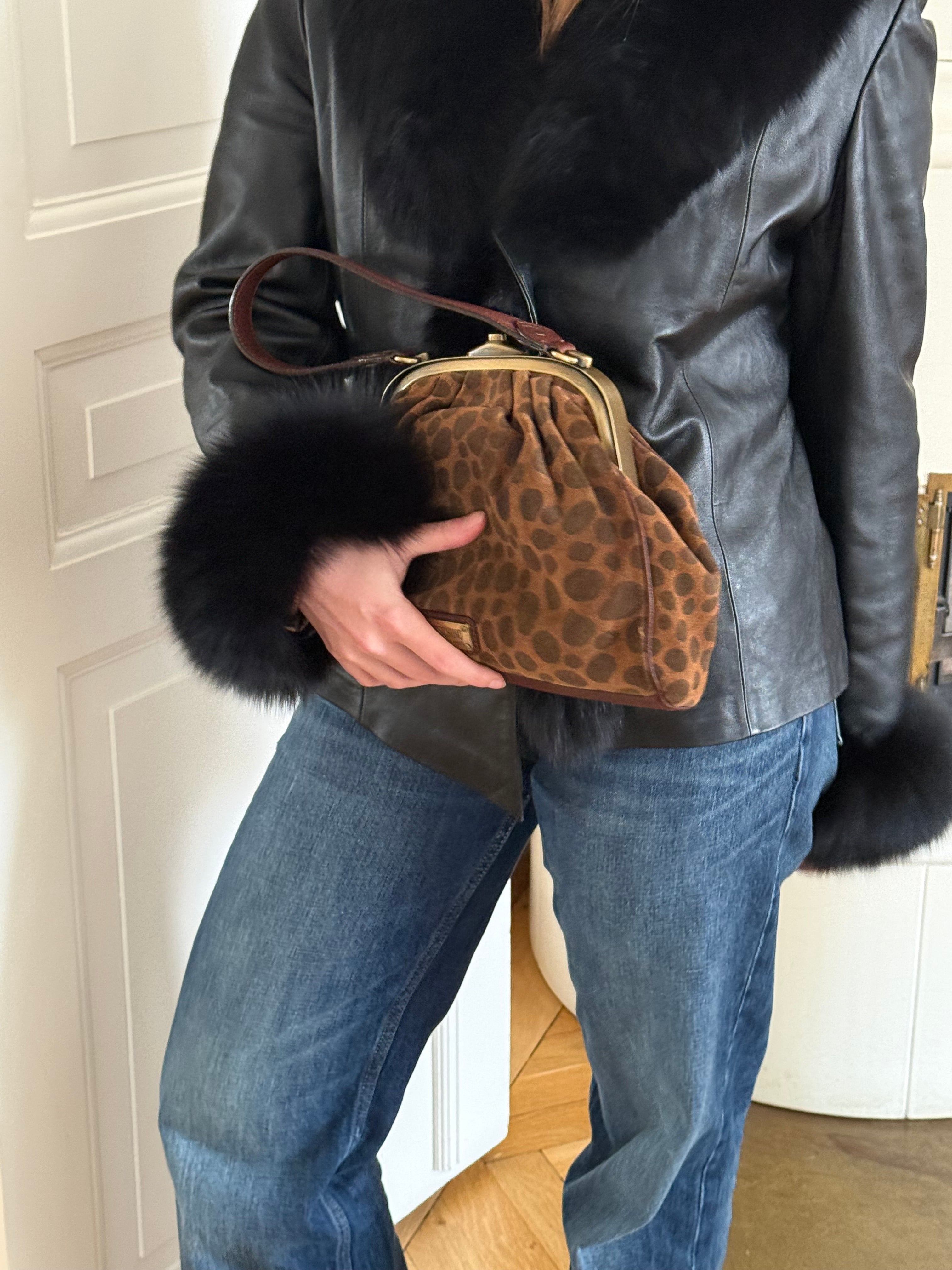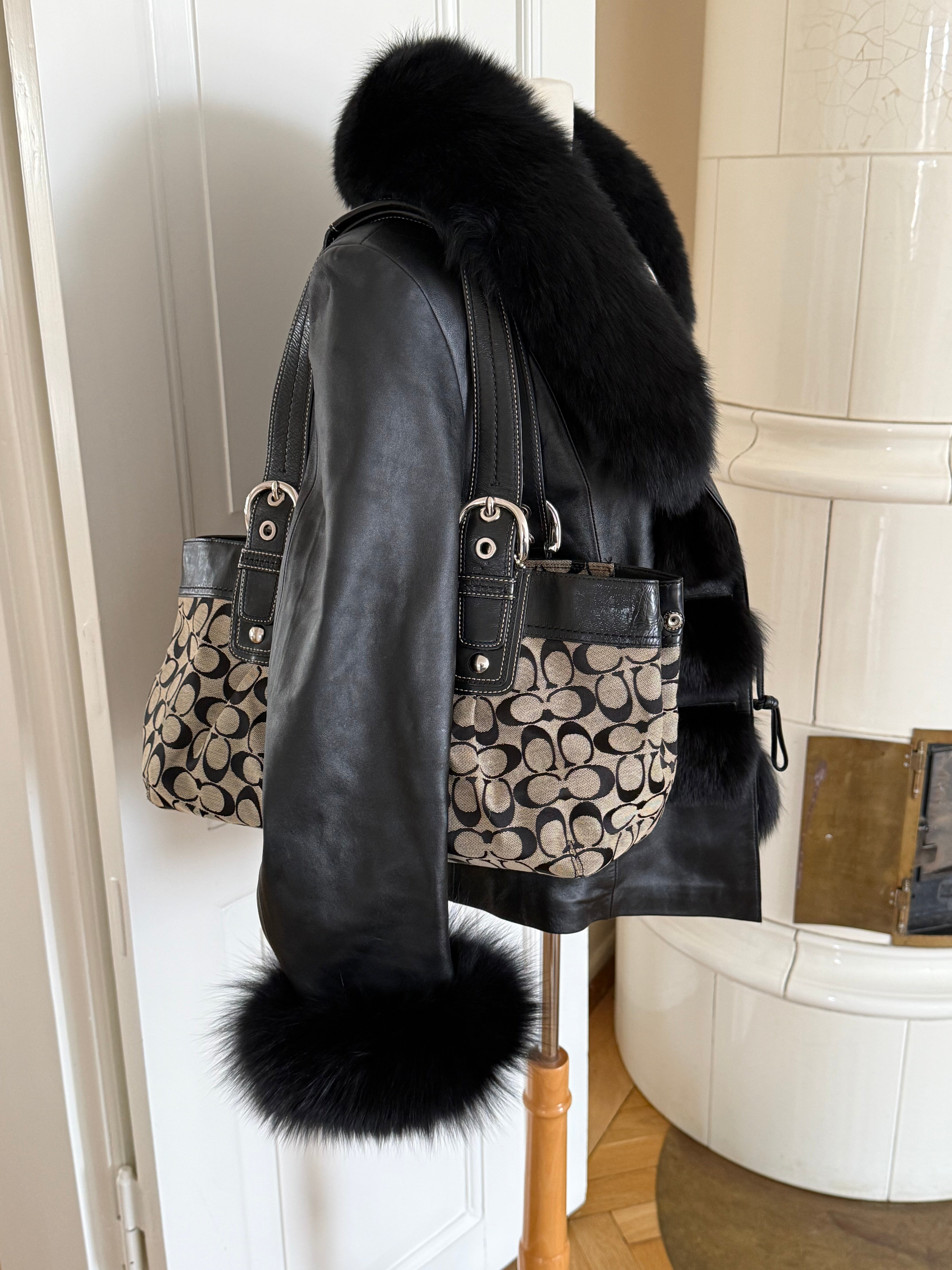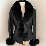 Leather jacket in black leather with fox fur trim at the collar and cuffs. The jacket features an asymmetrical front, button closure and a leopard print lining inside.
